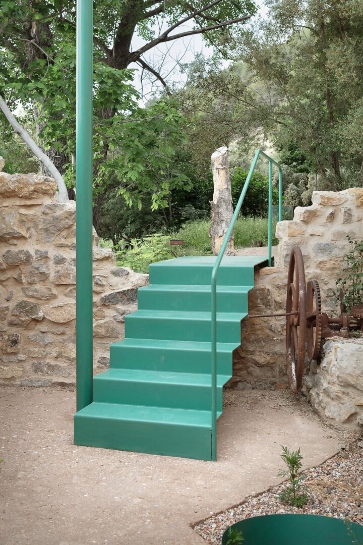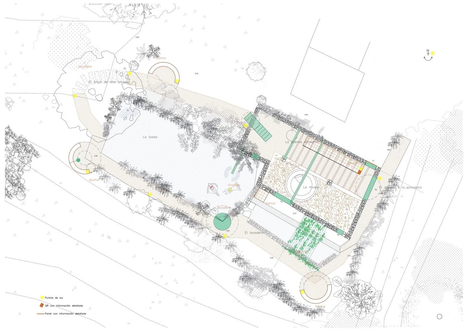 במרכז ההתערבות עומדת La Almazara de La Artejuela – טחנת השמן הישנה, שחוזקה באמצעות קורות מתכת, תוך שילוב שרידי המבנה המקורי כחלק מהריצוף החדש. פרגולה מעל אזור הכביסה משחזרת את תחושת הגג המקורי, וספסלים חצי־עגולים מוקמו בנקודות אסטרטגיות לאורך המסלול.