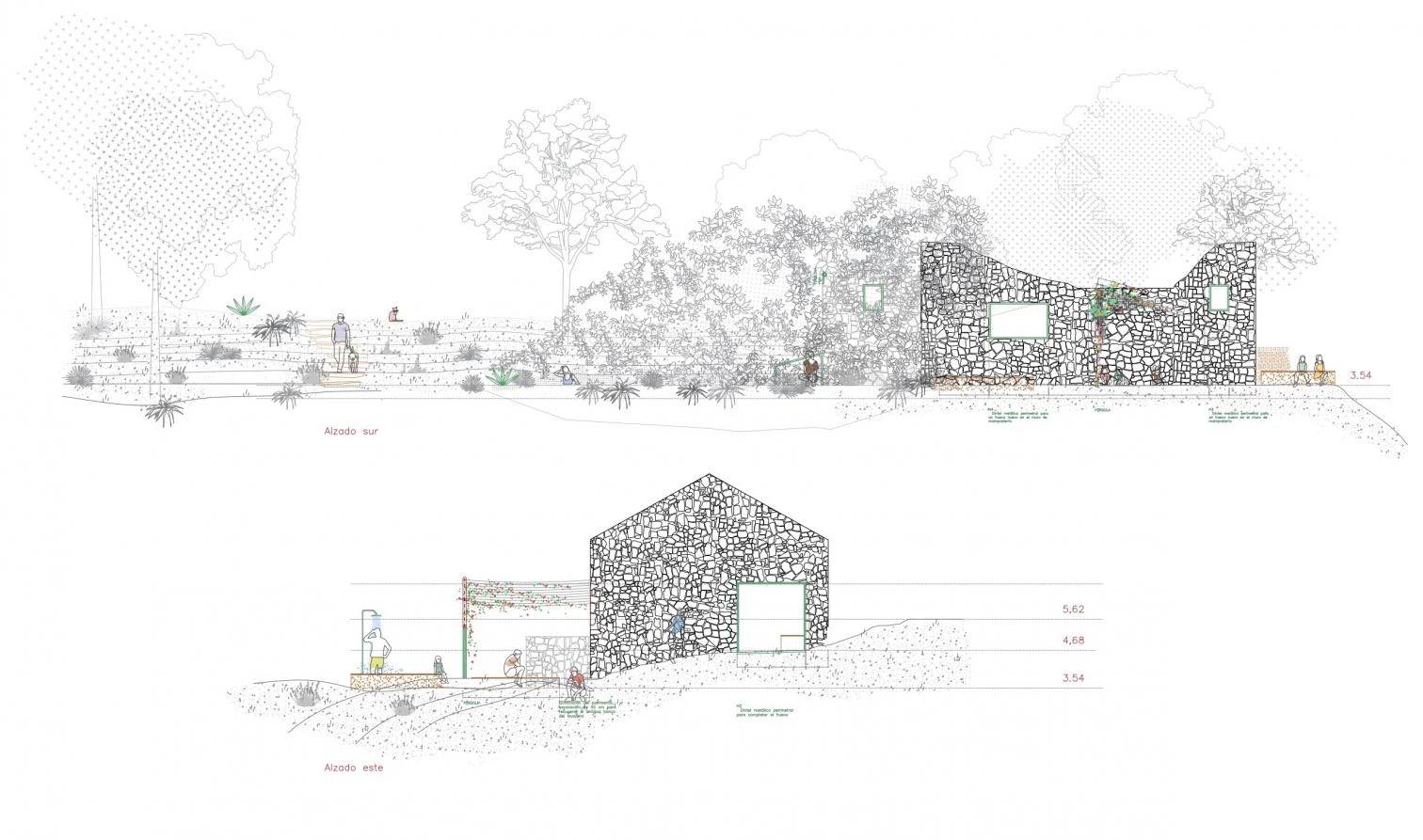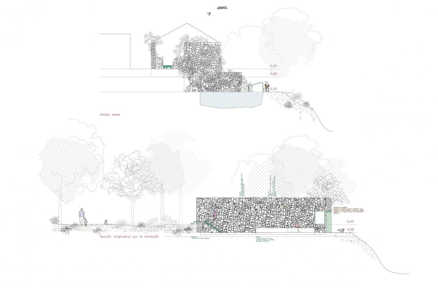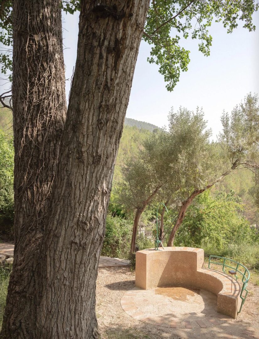 הירידה בין הטרסות עוצבה בבטון חשוף עם תוספות קרמיות המדגישות את התנועה ויוצרות גיאומטריה סביב המים. נקודות תצפית חדשות נפתחו אל ערוץ La Artejuela ויערות La Parreta, תוך שמירה על אזורי ישיבה מסורתיים שנוצרו באופן ספונטני על ידי התושבים.