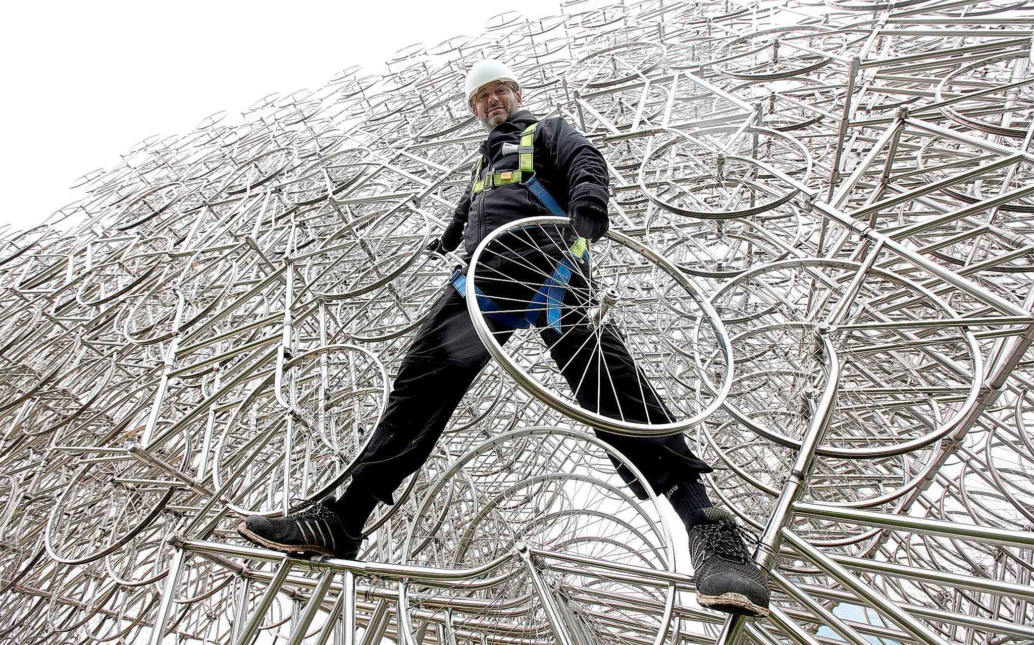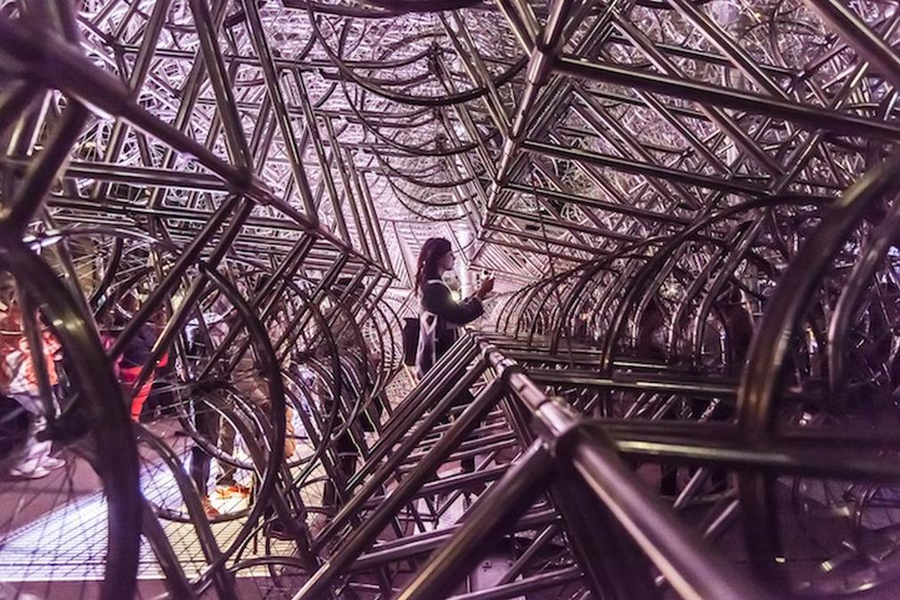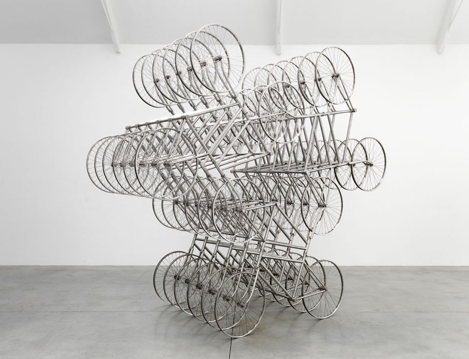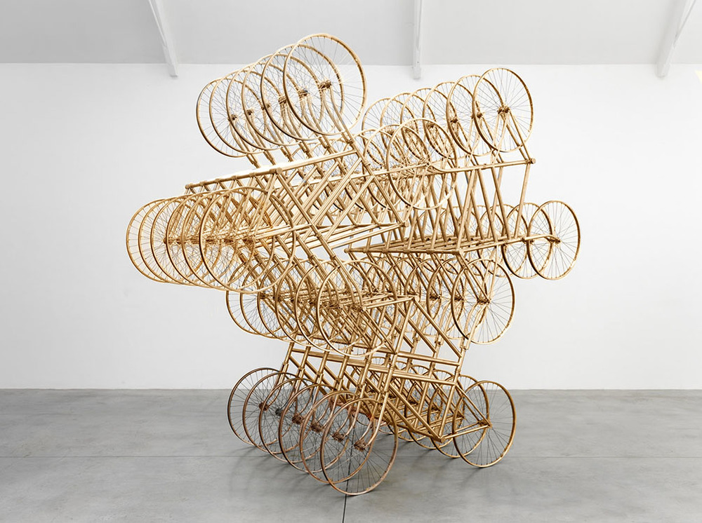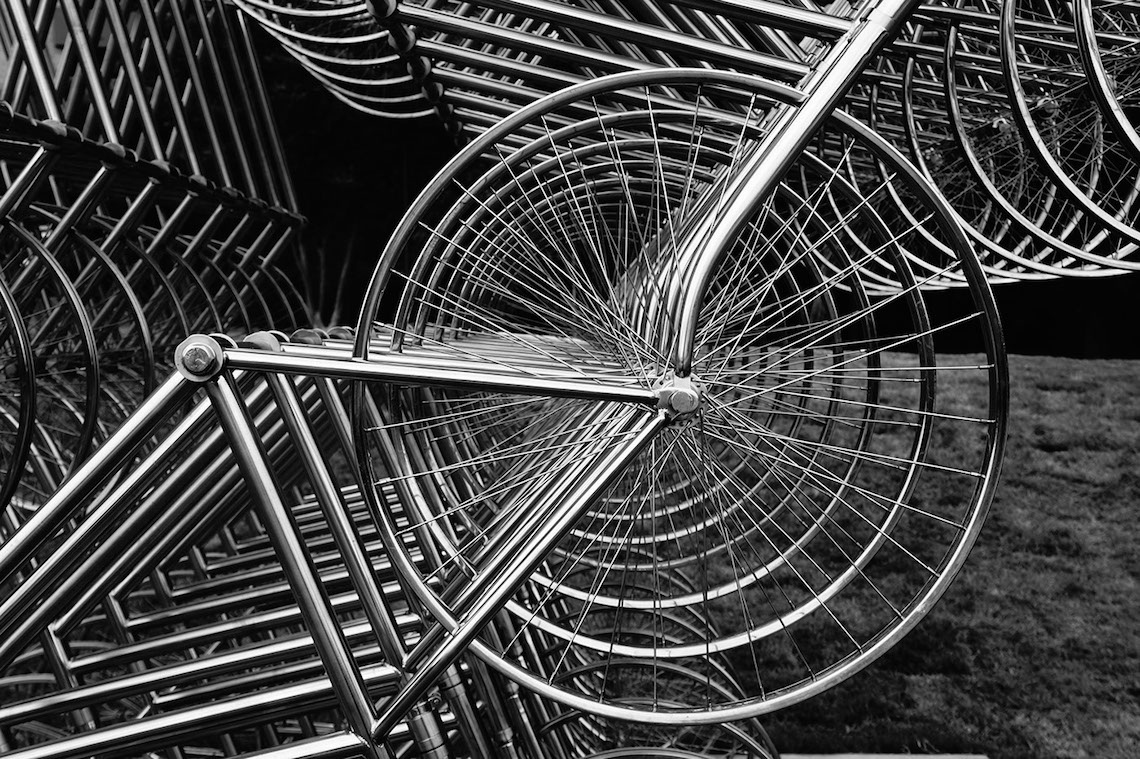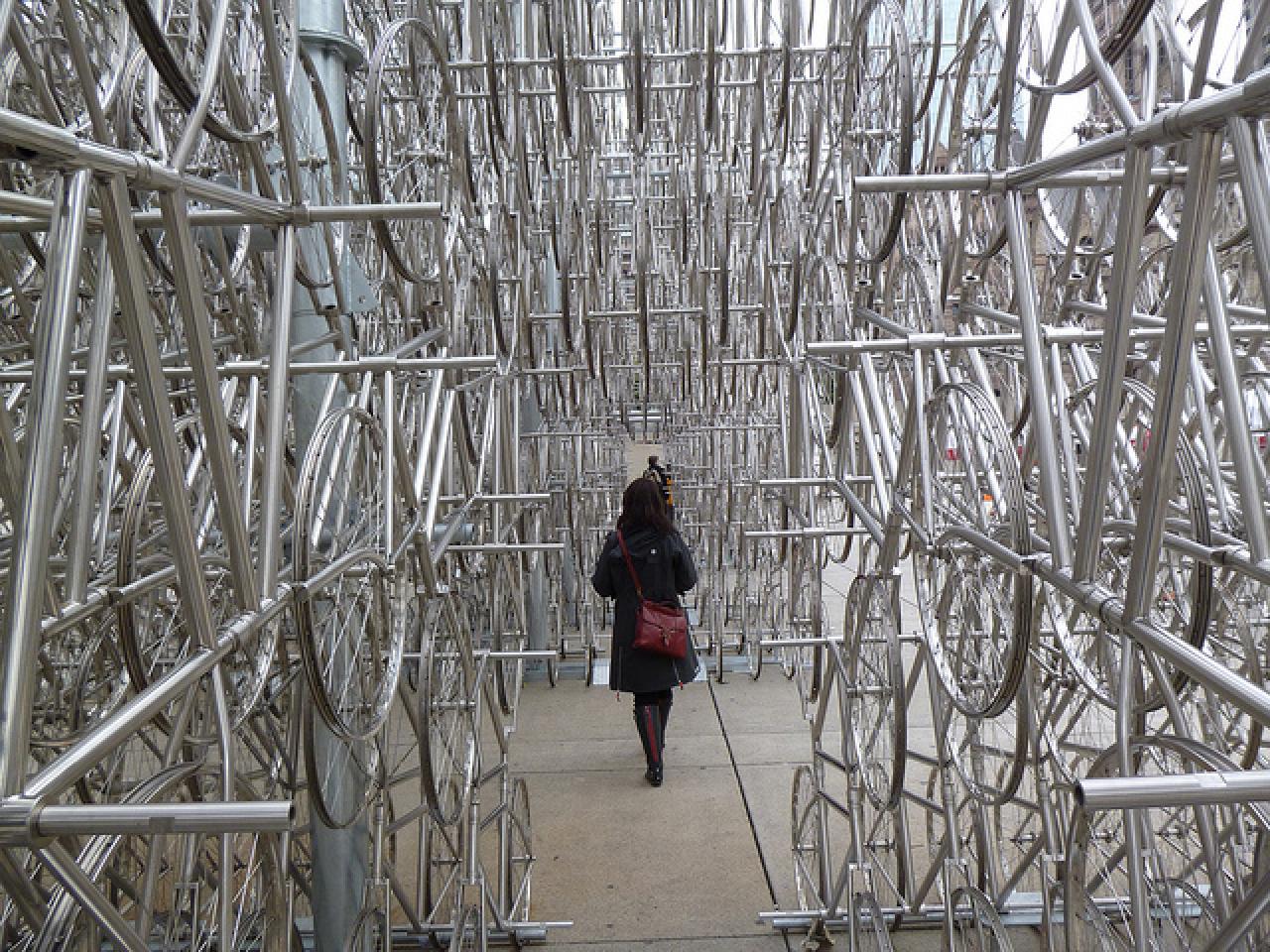 במיצב האייקוני של האמן הסיני Ai Weiwei, מאות אופניים זהים מחוברים זה לזה ויוצרים מבנה מרהיב, כמעט מהפנט.