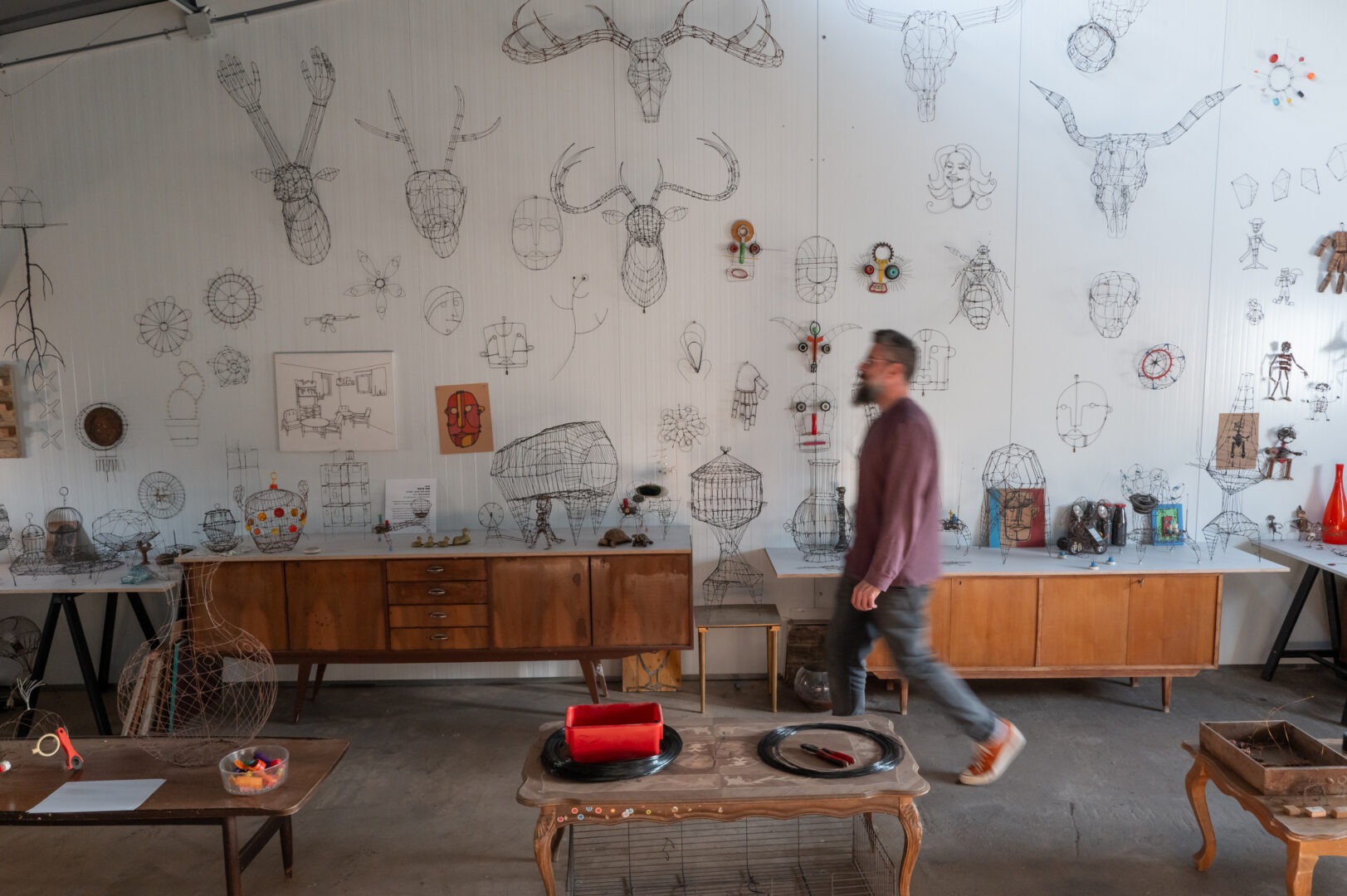 בסטודיו רחב הידיים שבקיבוץ לוחמי הגטאות נפרשים קווי מתאר דקים של עולם שלם. חוטי ברזל עדינים מתרוממים מן הרצפה, מתעקמים באוויר, ומשרטטים דימויים שנדמים כמרחפים בין רישום לפיסול, בין חומר לרוח. זהו מרחב העבודה של קובי סיבוני, אמן שהחומר המרכזי ביצירתו הוא לכאורה קשיח וקר – אך בידיו הופך לקו רגיש, פיוטי ומדויק.