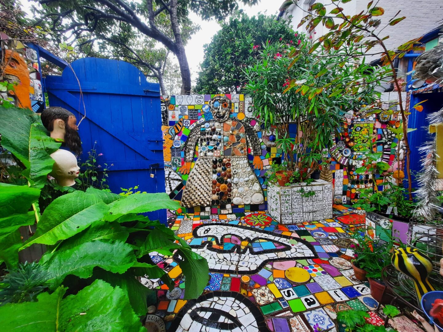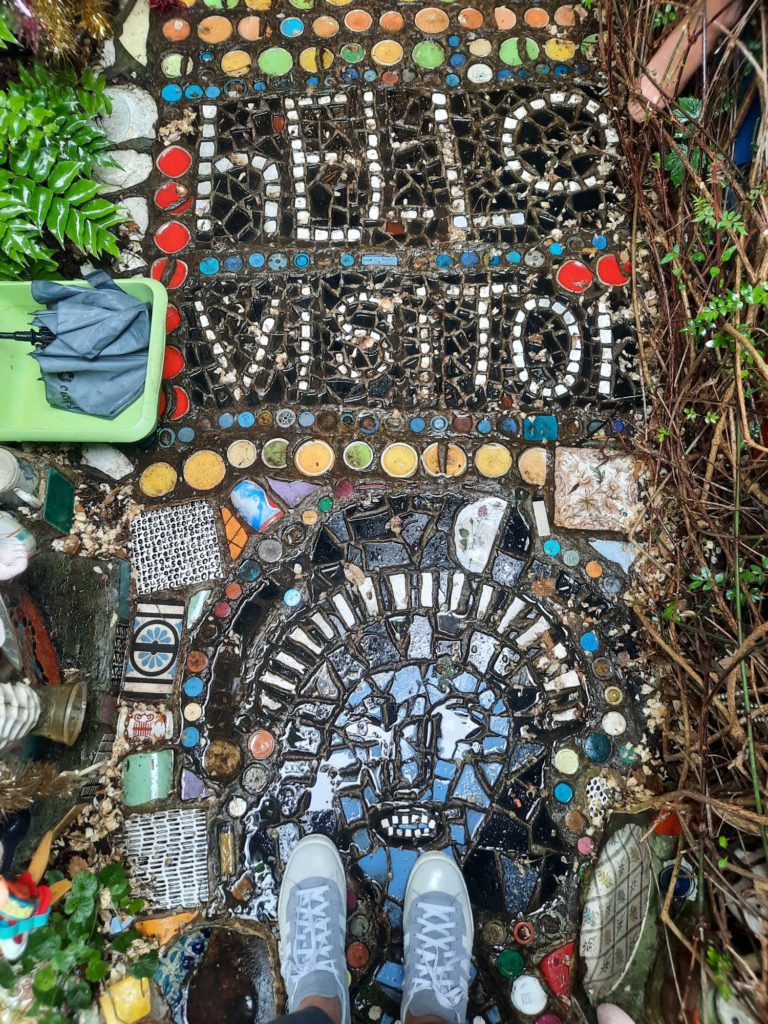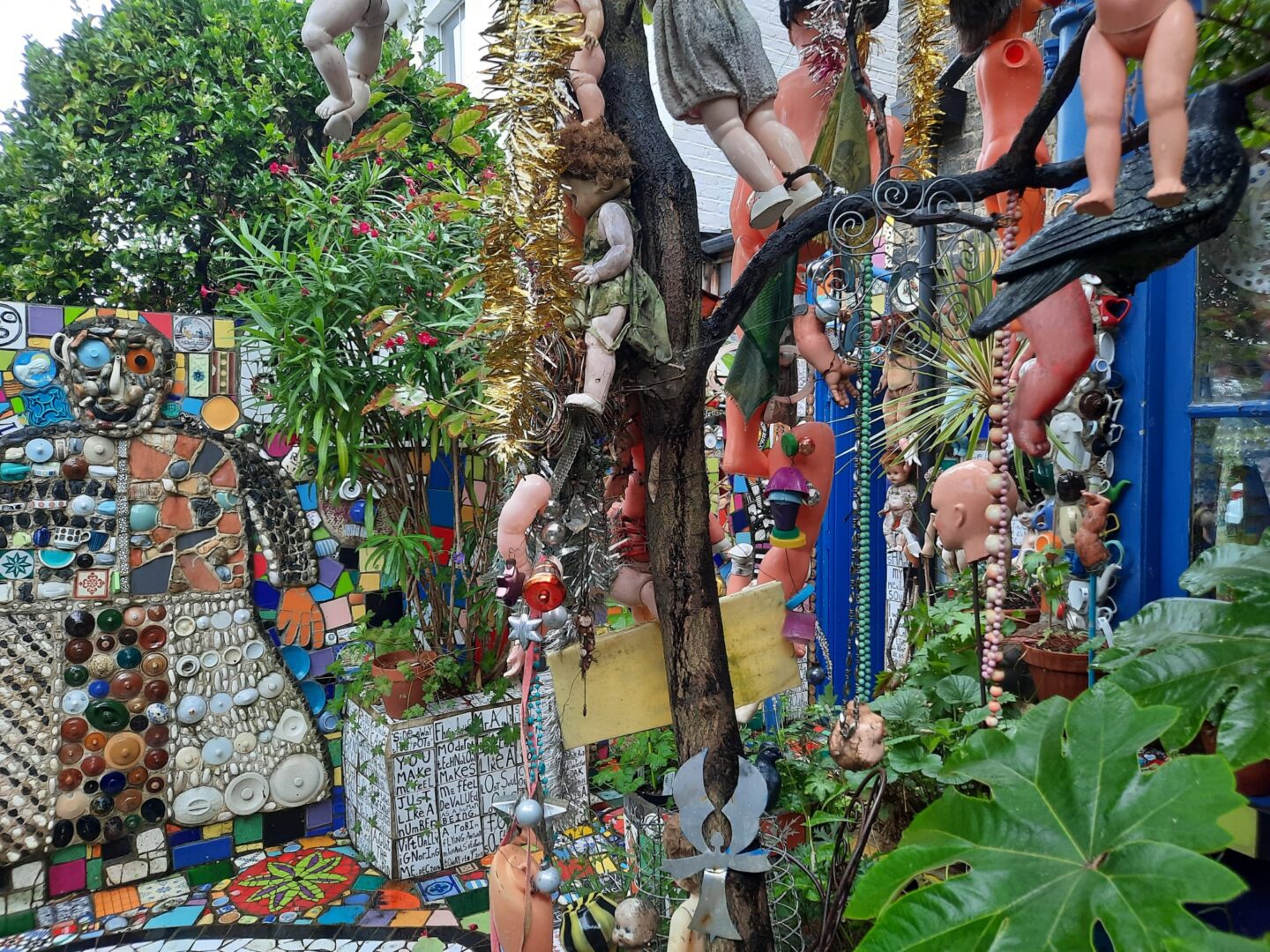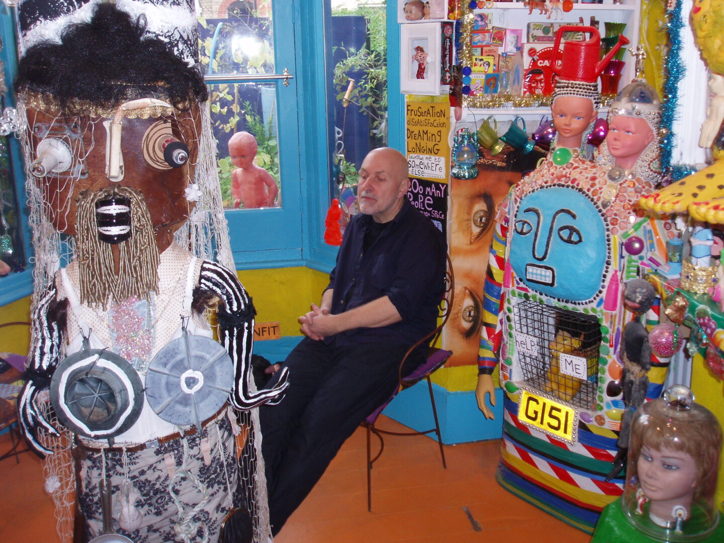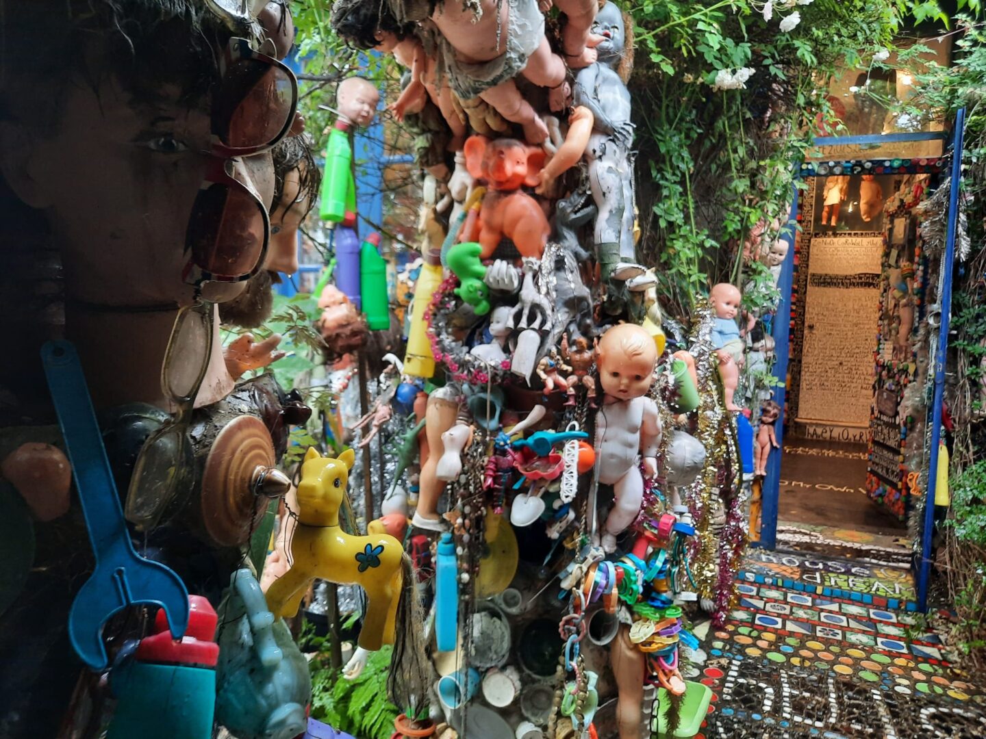 "שלום אורח" כתוב על שביל הכניסה לבית, לצד ראש בובה נכה מקרמיקה. בובות אדומות של ילדים עומדות בגינה ובוהות באורחים המגיעים ונכנסים לבית דרך קירות מכוסים בחלוקי נחל ובספלי תה אנגליים. לעתים קרובות האורחים מביאים איתם חפצים ותורמים אותם לבית. "אישה אחת הביאה מטען שלם של שיניים תותבות של דודתה, אהבתי את זה," הוא מספר ואכן, הן מותקנות כרגע על קיר הגינה הקדמית. "רבים מהאנשים שמעצבים את בתיהם, חושבים בכמה זה יוסיף להם כאשר ימכרו את הבית וזה לא מה שמעניין אותי," הוא אומר ומוסיף "כשאני הולך לבתים של אנשים אני חושב לעצמי, 'אלוהים אדירים, זה כל כך משעמם, איפה אתה בא כאן לביטוי כבן אדם שאתה"?
