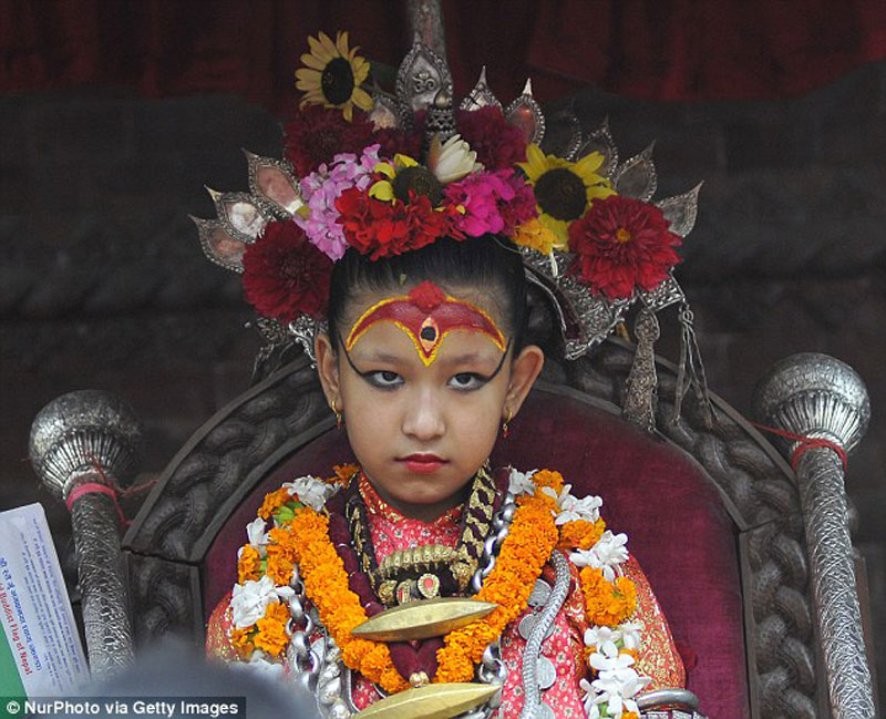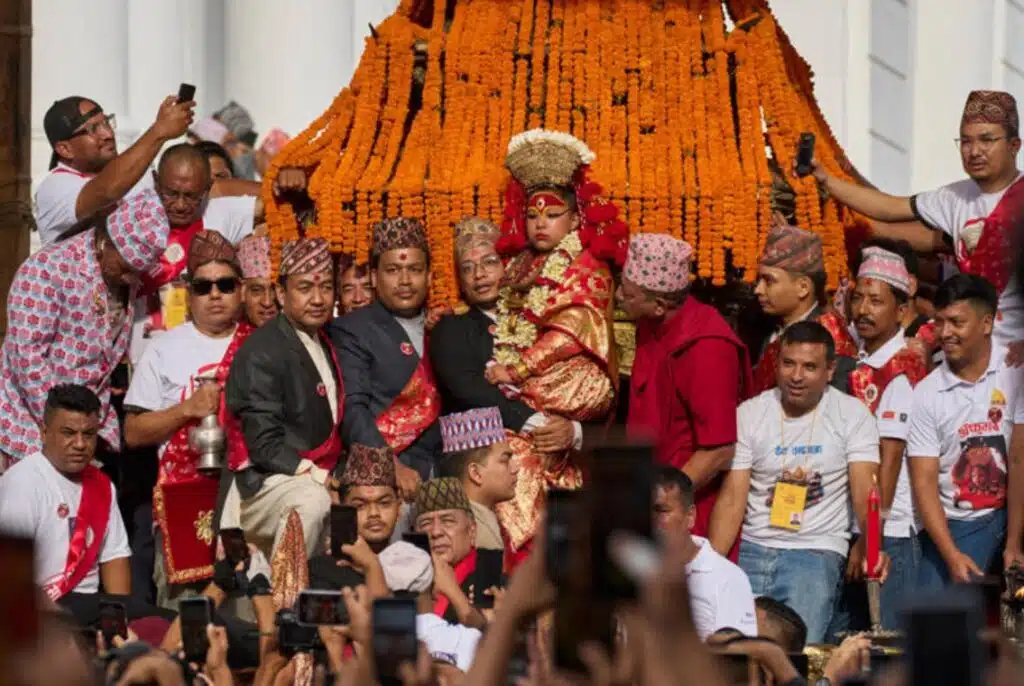 האלה החיה החדשה והמקודשת שלה סוגדים הינדים ובודהיסטים כאחד, היא ילדה בת שנתיים. היא נישאה על ידי בני משפחתה מביתם בסמטה צרה בקטמנדו, נפאל, עד לארמון המקדש קומארי גאר, בטקס הינדי הארוך והמשמעותי ביותר במדינה.