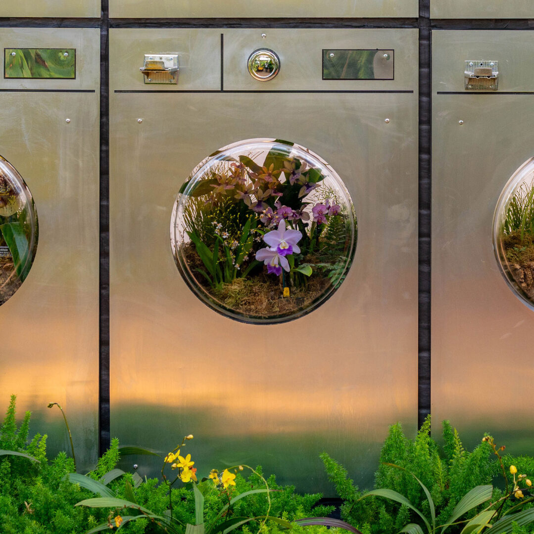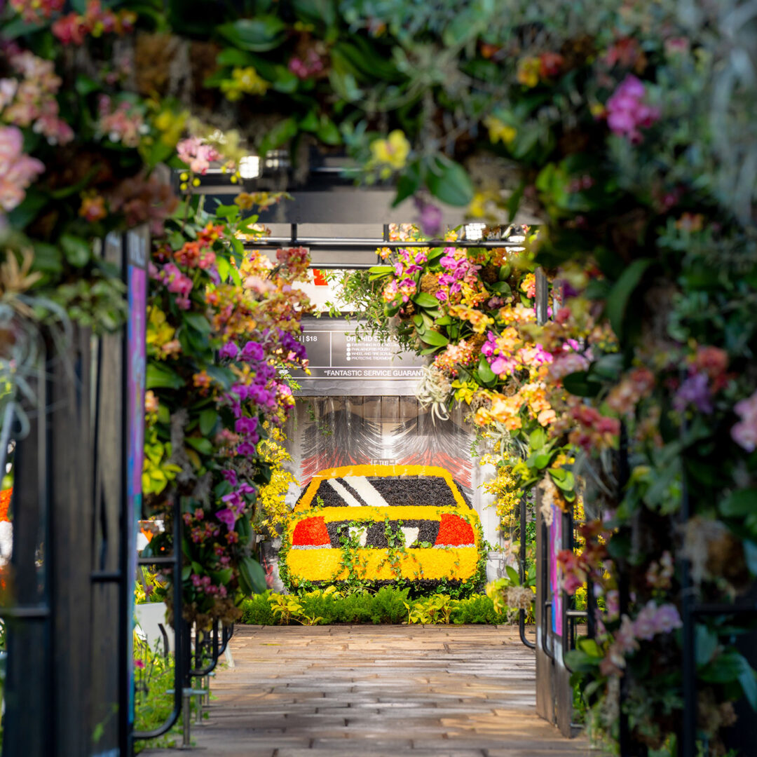 בין המיצבים הבולטים: “שטיפת מכוניות” עם מונית עטויה פרחים, מסעדת פיצה שמעוטרת בזרי סחלבים, ומכונות כביסה מלאות בפרחים שדרכן ניתן להציץ כמו דרך טלסקופ. המשחק בין קנה מידה גדול לקטן יוצר דיאלוג בין טבע למטרופולין – גרסה חלומית ופורחת של העיר.