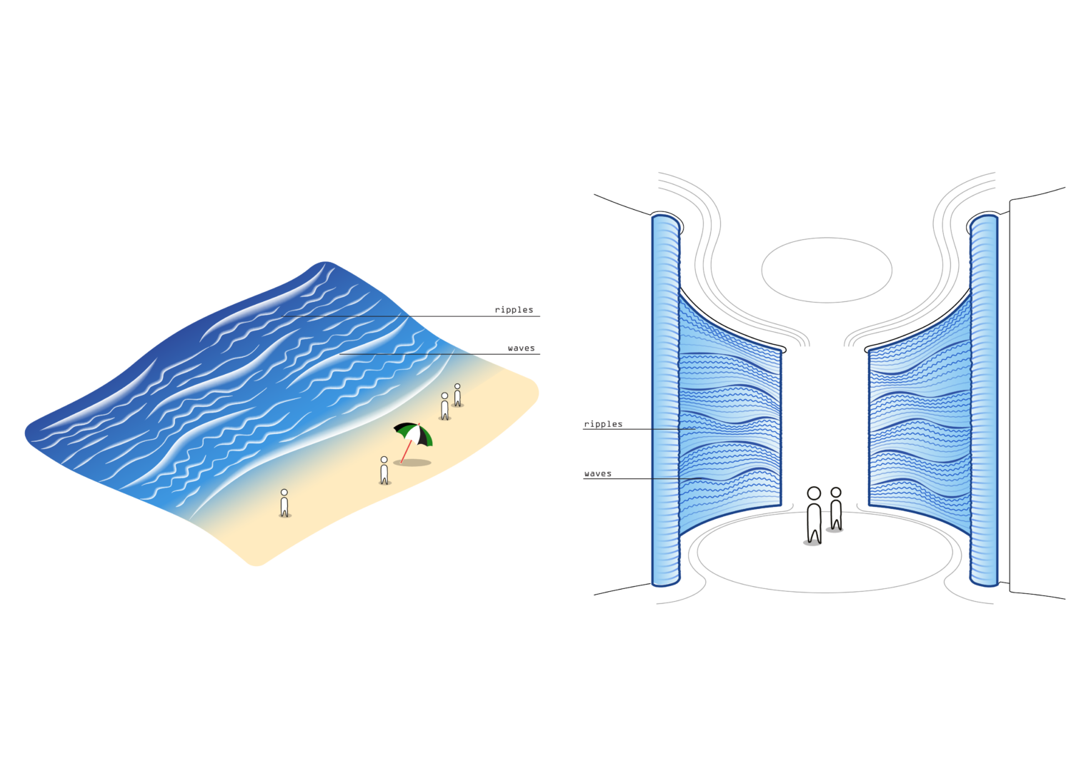 הקירות, בגובה שישה מטרים ואורך תשעה, מתעגלים בתנועה רכה המדמה גלי ים – מחווה ישירה למימי המפרץ הערבי הסמוכים. פני השטח מורכבים מדפוסים זורמים ושכבות עדינות, היוצרים משחק משתנה של אור וצל לאורך היום ומעניקים לחלל תחושת תנועה ורוגע בו־זמנית.