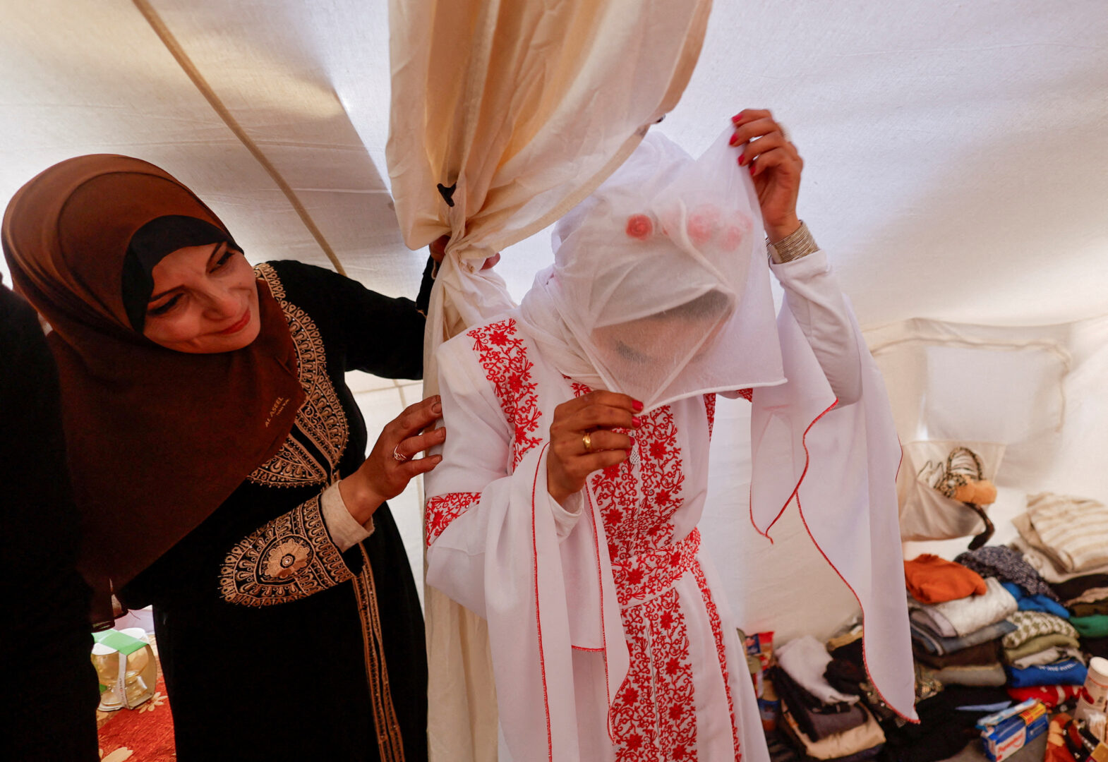 כלה פלסטינית מסדירה את הרעלה שלה ביום חתונתה, במחנה אוהלים ברפיח, בעיצומה של המלחמה בין ישראל לחמאס, 18 בינואר 2024. רויטרס/מוחמד סאלם