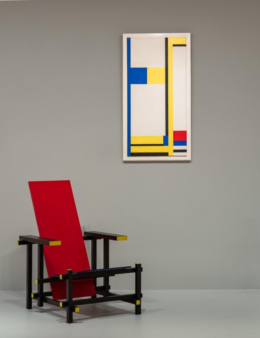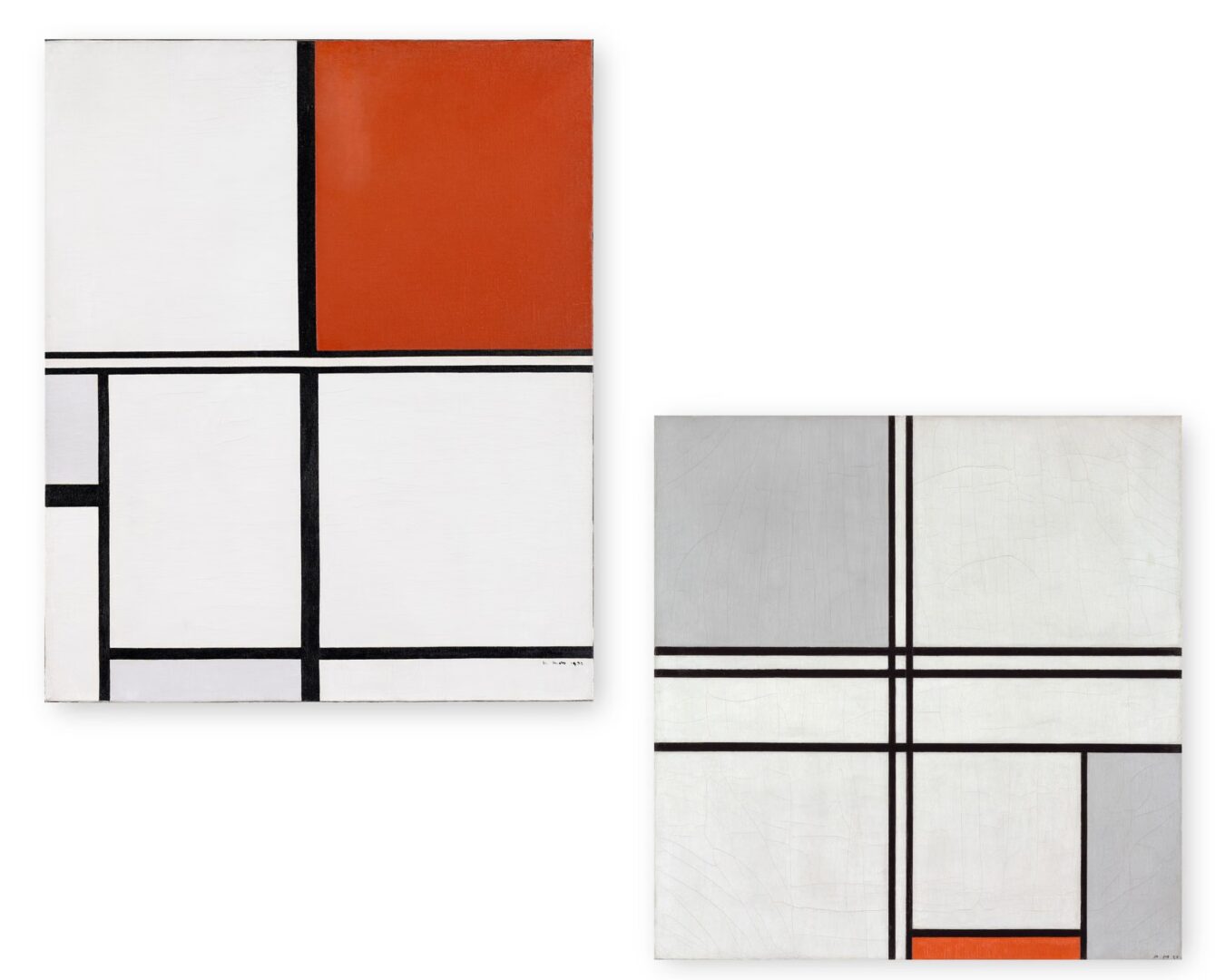 left, Moss’s White, Black, Red and Grey, 1932; right, Mondrian’s Composition (No 1) Gray-Red, 1935 Composite