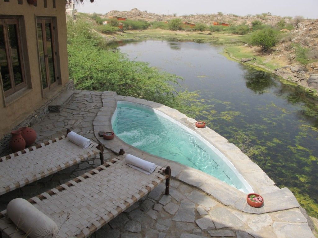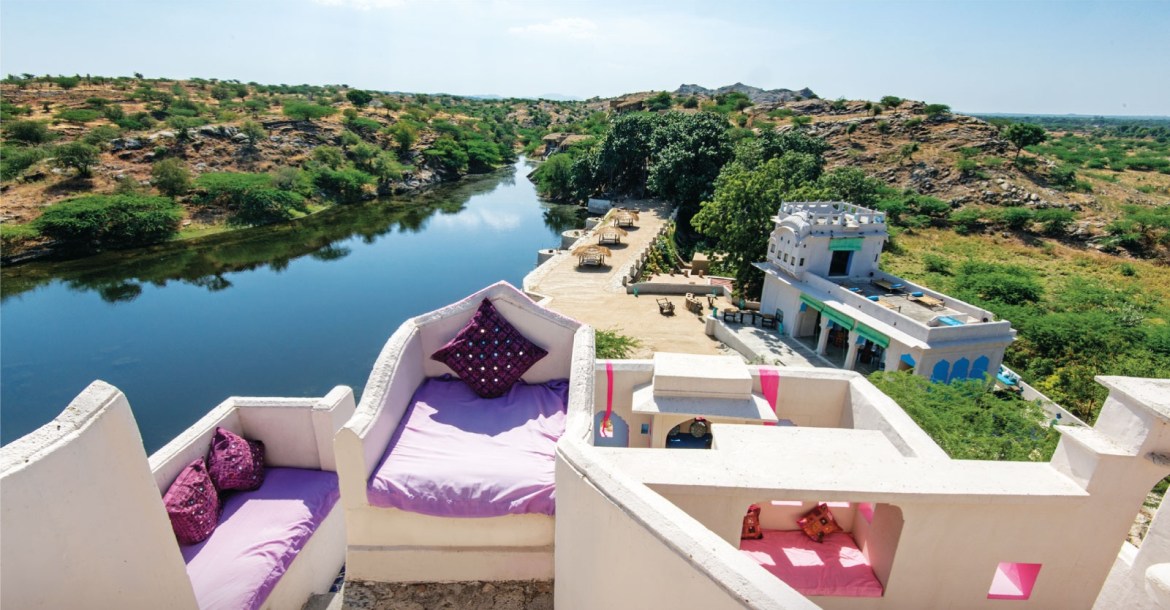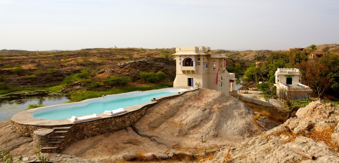 מלון יוקרתי המעוצב ברוח המורשת ההודית, עם 12 קוטג'ים בנויים מבוץ ואבן, ידידותיים לסביבה בפאלי, רג'סטאן, הודו