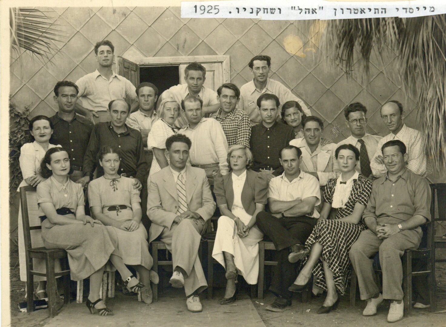 מייסדי וחברי תיאטרון 'אהל' ליד הצריף 1925 שורה ראשונה – שלישי משמאל אברהם חלפי, חמישי משמאל מאיר מרגלית