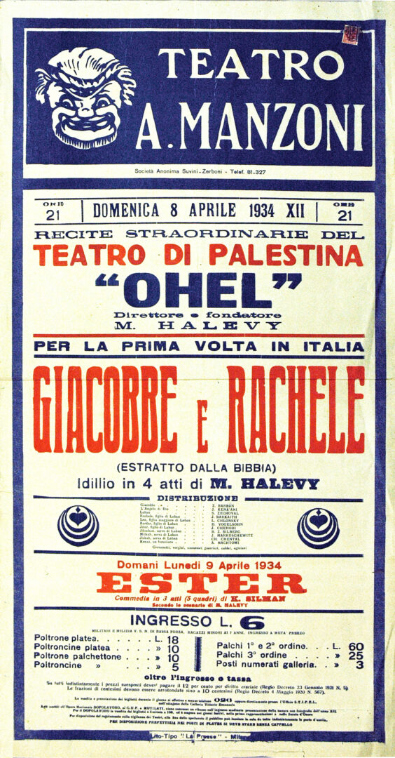 כרזה סיור הופעות באיטליה 1934 עם שני מחזות תנכיים מגילת אסתר ויעקב ורחל