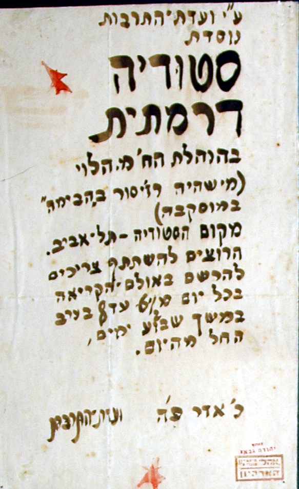 וביום גשם אשר כזה, יום זיו טובל בדמעות, שיד נעלמה ממהרת למחות אותן מעל פני האדמה המחייכת, יצא פקיד אלמוני של "וועדת התרבות ליד ההסתדרות הכללית של העובדים העברים בארץ ישראל" מתוך צריף התרבות ברחוב נחמני, לא הרחק מפינת אלנבי, ובידו גיליון נייר וארבעה נעצים, על גיליון הנייר הייתה רשומה, בכתב מכחול עבה ומאומץ, ובצורה שתהיה בולטת לעין, הודעה חשובה לכל המעוניינים.