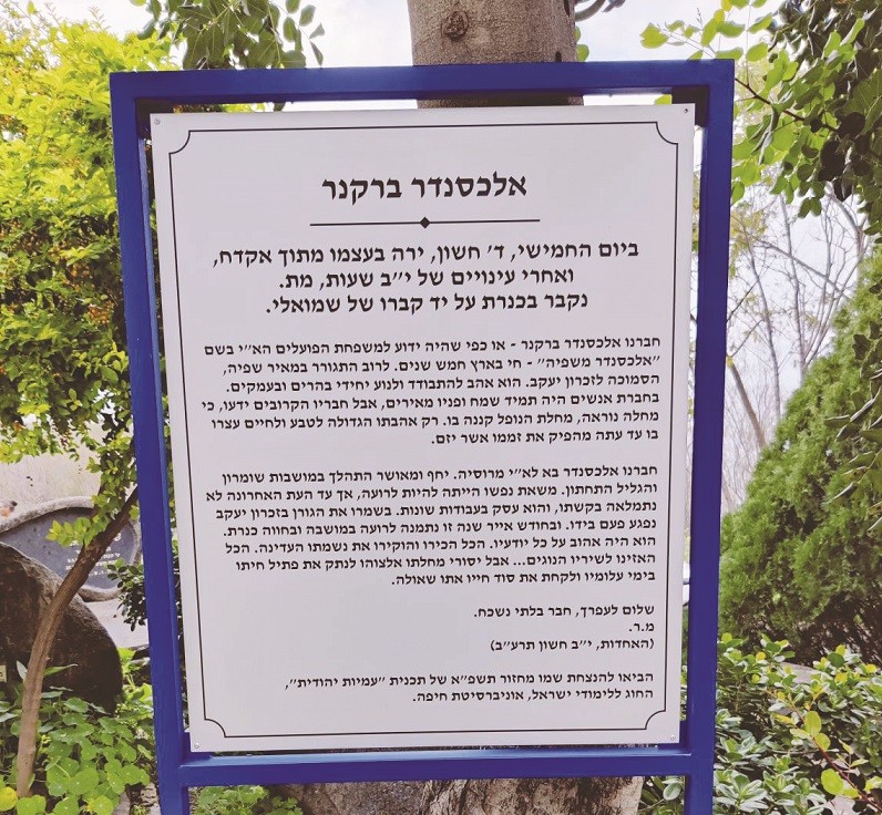 השלט ליד מצבת ברקנר בכנרת