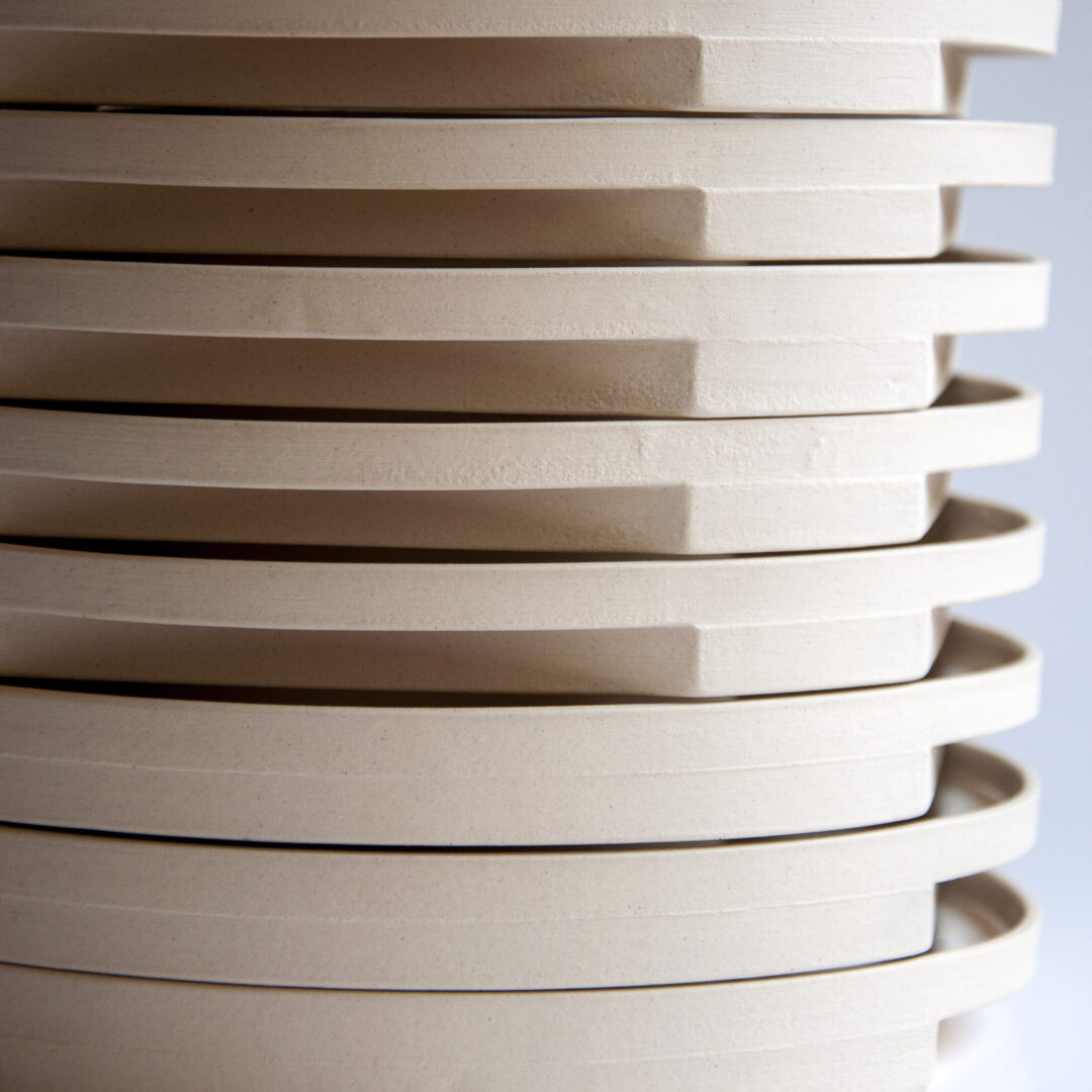 בלב תערוכת היחיד הראשונה של יערה רבינוביץ, אדריכלית, מעצבת ואמנית קרמיקה, מונחת אחת משלושת צורות היסוד, צלחת. מבטה של רבינוביץ באובייקט הצלחת שומט את הייעוד ארוך השנים שניתן לו.