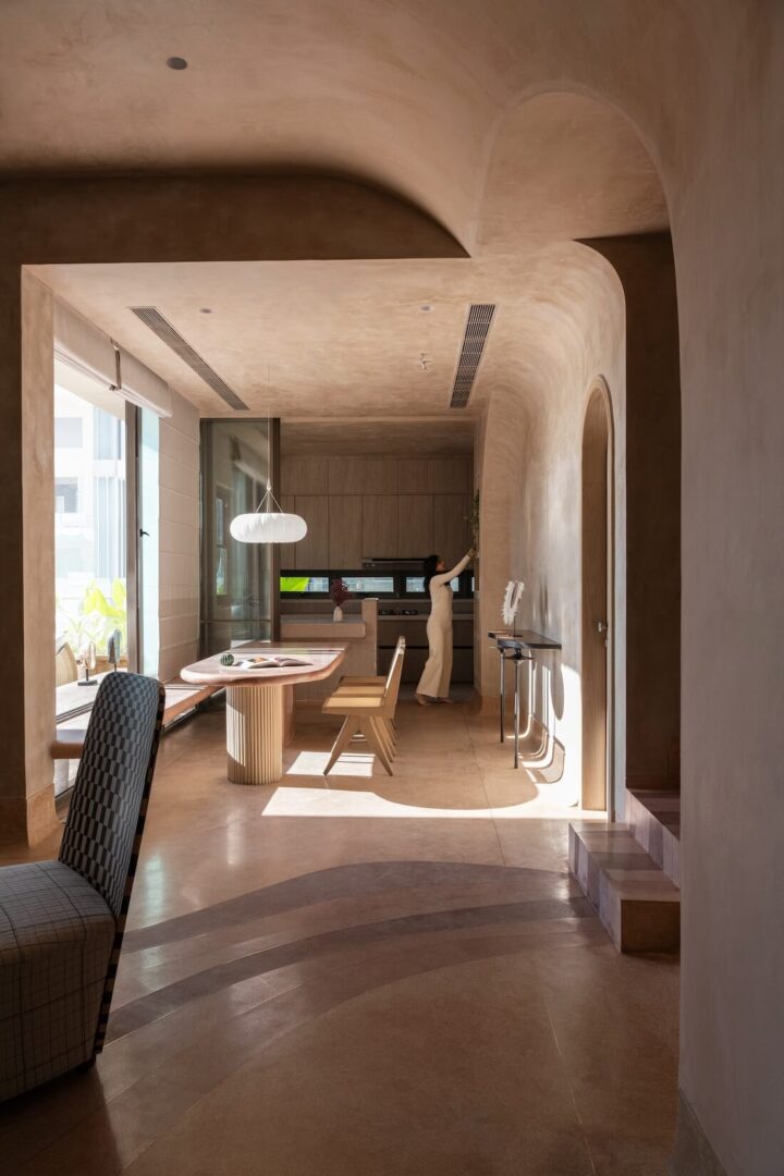 הקומה התחתונה של הדופלקס, הכוללת שטחים פנימיים ומרפסת בפרופורציות שוות, משלבת בהרמוניה את החוץ עם הפנים. כדי לשבור את קשיחות הפריסה, עוצבו עקומות, שהוסיפו תחושה של נזילות ותנועה בכל החלל הזורם מבפנים החוצה. פתחים מקושתים וצמתים עקומים, מעוצבים בקפידה, שם קירות נפגשים עם תקרות ומעניקים איכות פיסולית לחלל.