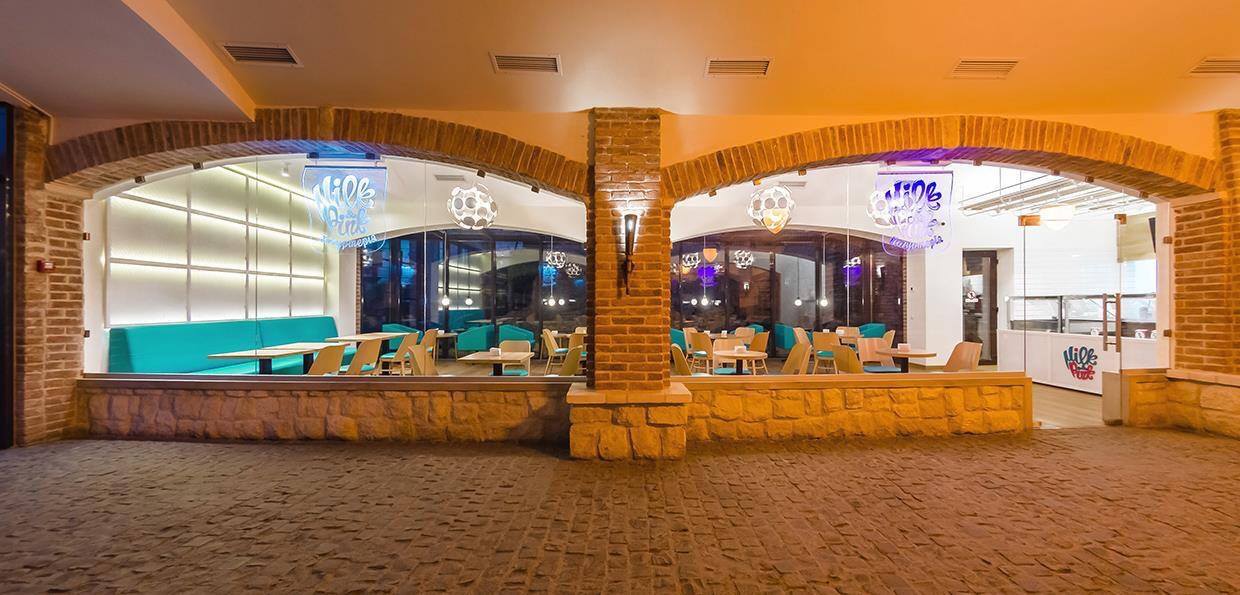 את הגלידרייה Milk & Pink באוקראינה, עיצב mishael samoriz בתוך חורבה נטושה והרוסה, אשר קירות הלבנים ההרוסים שלה, שימשו תפאורה דרמטית לצבעוניות מלאת החיים של הגלידרייה.