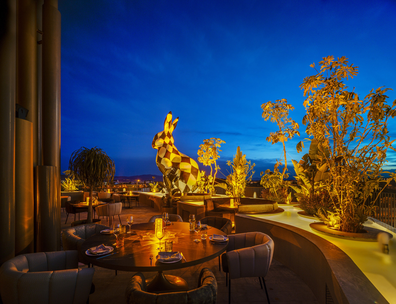 המסד הדו-מפלסי של הבניין, מוזז מעט זה מזה ויוצר מרפסת גדולה על גגו, שבה המסעדה. מעל זה מופיע ה"טוטם" (סורג גדול של צינורות מתכת התומכים בשלט המכתיר את הבניין) ומרפסת מוגבהת, שחצתה בריכה שלוחה משני הצדדים, אשר בהישענות רק על שתי ליבות בטון מרכזיות, משתלטת על 22 מטרים.