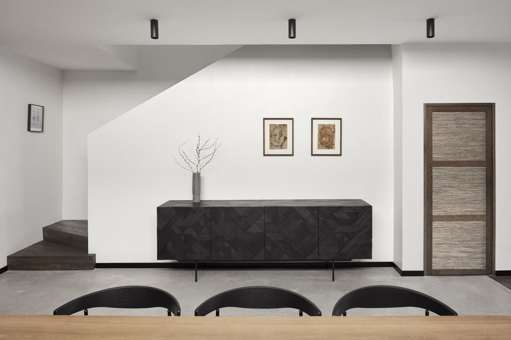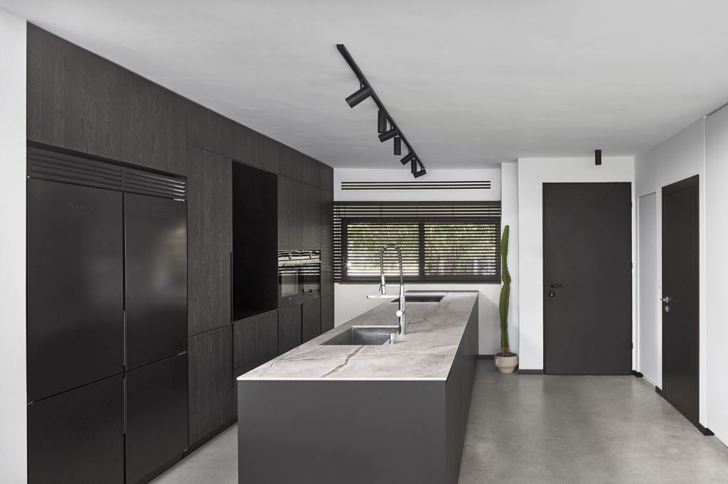 גם מטבח העץ נצבע בשחור, לצדו חלון רחב עם תריסים שחורים, ועל אי העבודה פלטת גרניט פורצלן כהה דמויית שיש. לצדו, פינת האוכל, עם שולחן בסגנון סקנדינבי פשוט ונקי, וסביבו כיסאות שחורים.