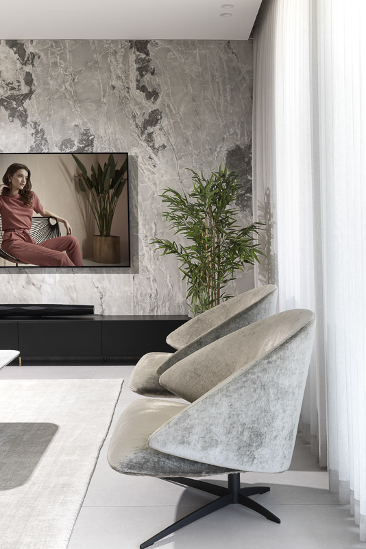 "כדי לייצר את הזרימה בחלל", ממשיכה שיסמן, "בחרתי בקיר כוח אחיד למטבח ולסלון, ללא שימוש במספר חומרים. בחרתי באריח גרניט פורצלן מדוקק וזרמתי איתי לכל אורך הקיר – מהטלוויזיה ועד לחיפויי של המטבח וכך יצרתי שפה עיצובית אחידה. הסלון הוא בצבעים על זמניים ומודרניים ואת הצבע הכנסתי באמצעות אלמנטים שונים. אחד מהם למשל הוא ספריה הממוקמת מאחורי הסלון, שמצד אחד היא מסתירה את המערכות הטכניות בבית ומצד שני היא מוסיפה לעיצוב החלל. בגלל שיש מגבלת מקום – החלטתי ליצור אלמנט מעוצב עם מוטות פליז בהזמנה מיוחדת שנתפרה למידות בשטח".