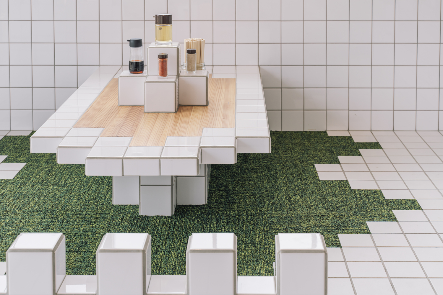 החומרים המרכיבים את המסעדה זו הם רגילים וזולים, כמו אריחי קרמיקה לבנים, עץ, מלט ואריחי שטיח. המילה היפנית "つけめん" ("Tsukemen" היא ראמן אטריות, שהוא סמל החנות הזו) על השלט, מורכב מקוביות, שהן כמו פיתוח תלת מימד של פיקסלים. פינת הישיבה לקבוצת סועדים, תוכננה כך שתראה כמו טירת משחק, עם קיר נמוך למניעת נפילה של ילדים וליצירת תחושת פרטיות.