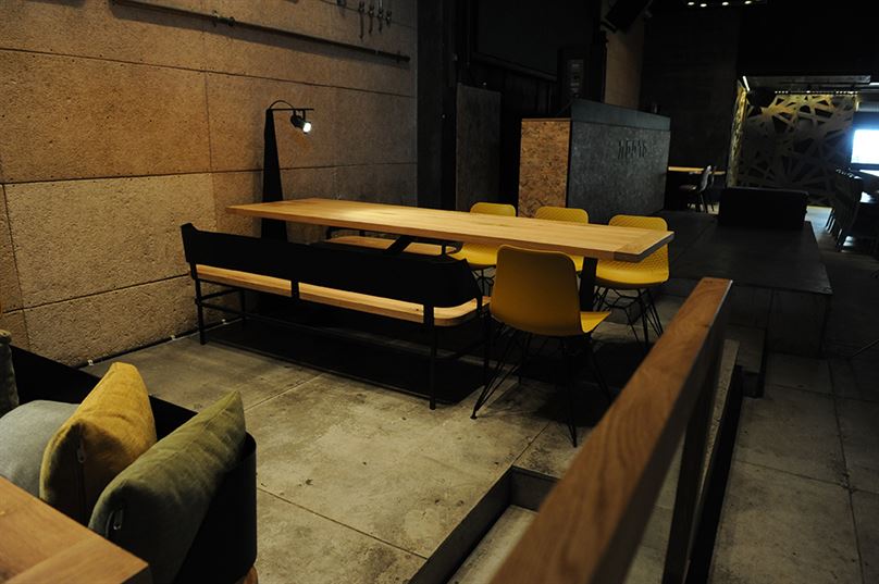 תכנון המקום בונה חווית מרחב כולל, כאשר הבמות מייצרות את התחושה האינטימית. כדי לחדד את החוויה, עוצבו ספסלי ישיבה מברזל שחור ועץ אלון בגדלים שונים: זוגיים ותלת עם מזרונים וכריות, מערכות גבוהות עם כסאות מחוברים, כך שכל איזור מאפשר חווית יישיבה ומפגש אחרת.