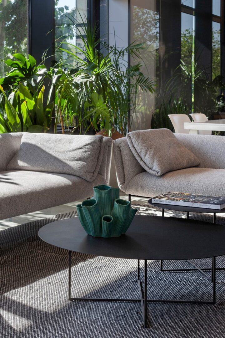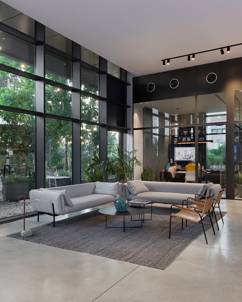 המרכז מוקף בחלונות ויטרינה גדולים ומרשימים לכן גם סביבת החוץ, שתוכננה בסבב הקודם בקפידה, עברה גם היא מתיחת פנים. מעצבת הנוף רווית גרינבויים לקחה את הקיים ונתנה לו טאצ' עדכני שמתכתב עם הפנים.