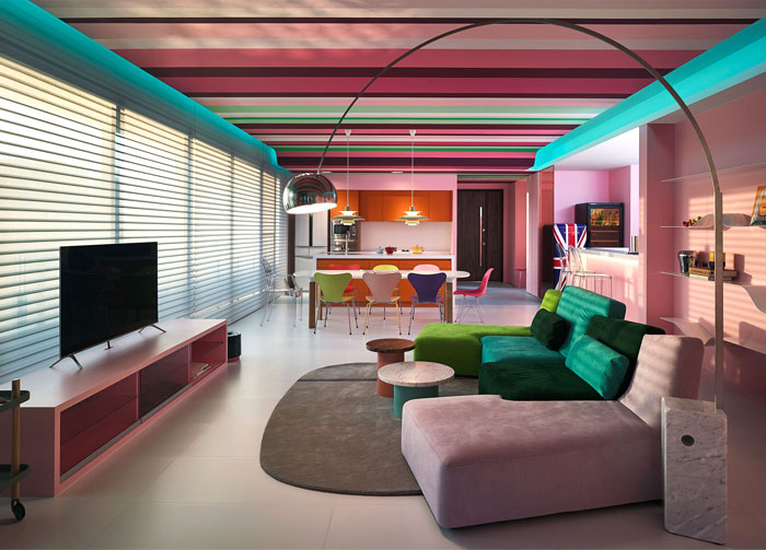 עיצוב מרהיב עם אלמנטים ייחודיים וריהוט מרתק. הסטודיו הבריטי FU-GE Design חיבר יצירה עכשווית וצבעונית. צירוף פנטסטי בין הנקודות שיוצר האמן היפני יאיואי קוסאמה, הפסים של המעצב הבריטי פול סמית, עם מותגי עיצוב הרהיטים הנודעים, אקלקטי עד הסוף.