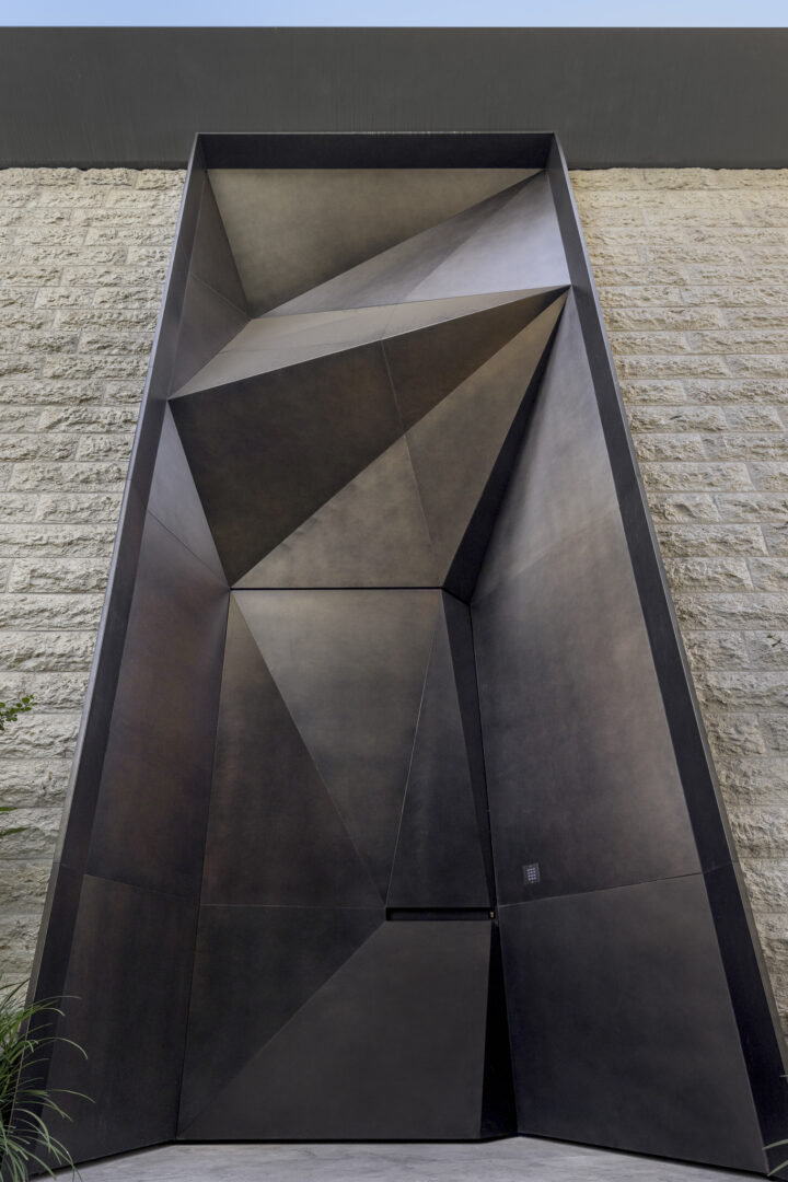 השער הראשי וגרמי המדרגות מובילים את הבאים לחזית הכניסה שם תוכננה דלת גדולה ומונומנטלית: "היות והדלת היא צדדית בחרנו להבליט אותה ולהפוך אותה למוקד כוח אקסקלוסיבי ודינמי על מנת שלא תיטמע ותלך לאיבוד. יצרנו דלת פרספקטיבות בדוגמת קיפולי אוריגמי עשויים מנחושת, שמייצרים פרספקטיבה דו ותלת-מגוזיות ומפתים את הבאים להיכנס פנימה", אומר ישראלביץ "דרכה נכנסים ישירות לחלל הציבורי רחב הידיים שם מצויים הסלון, המטבח ופינת האוכל, מהם נגלה הגן הפנימי שמשמש הלכה למעשה כ- outdoor living ותחום בין 3 קירות זכוכית שמגוננים עליו מפני משטר הרוחות הערות באזור. בסביבת בריכת השחיה תוכננו אזורי ישיבה הכוללים ספות, כורסאות ומיטות שיזוף ובסמוך ממוקם מטבח חוץ מקצועי ועצום בגודלו שמשתרע על פני לא פחות מ-40 מ"ר".