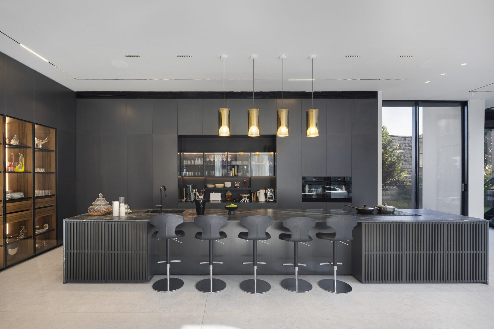 בקומת הקרקע תוכננו גם סוויטת השינה של אחד מילדי המשפחה, גרם מדרגות מפלדה שנאמן לגיאומטריית המבנה והמעלית שמקשר בין המפלסים. "הבית תוכנן בצורת ח' שאפשרה לנו לחלק את הקומה הזו לשני אגפים וכך מתקיימת הפרדה מוחלטת בין פונקציות האירוח לאזור הפרטי", מסביר האדריכל. "עיצוב הפנים הוא מודרני בתכלית ויחד עם זאת, העובדה שבחרנו לעטוף את החללים בחומרים כדוגמת אבן טבעית, שיש ודקטון מקנים להם מראה חמים, עשיר ועתיר בשכבות ורבדים. לתחושה הזו תורמות גם יצירות אמנות משובחות שבני הזוג אצרו לאורך השנים ושולבו בחלקים שונים של הבית".