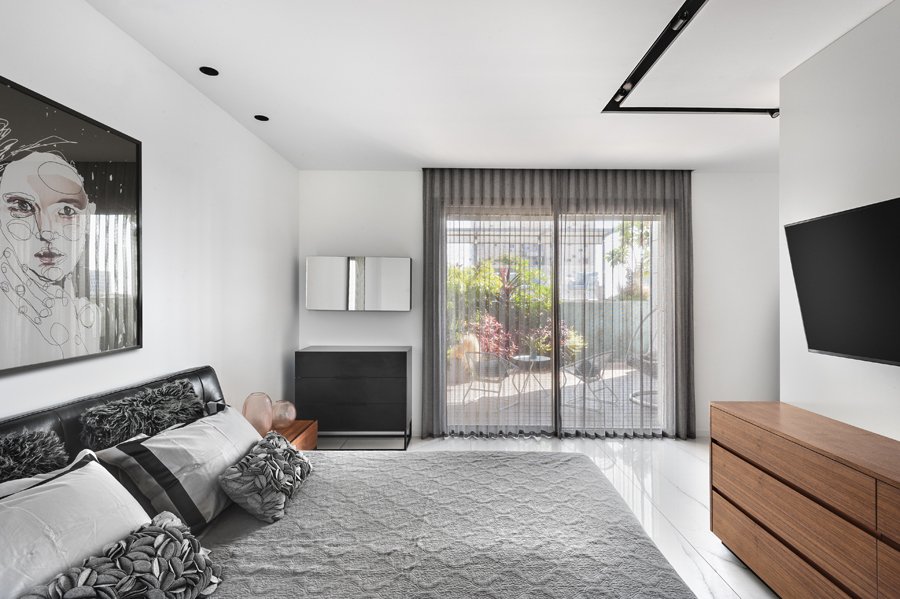 סוויטת ההורים המפנקת כוללת חדר ארונות וחדר רחצה, ובנוסף יציאה למרפסת פרטית ורומנטית. החלל מחופה אף הוא באריחי השיש גדולי הממדים, למראה לבן ונקי, חרף הגידים העדינים באפור. החלל עצמו עוצב בגווני לבן ואפור ונגיעות של ורוד. פריטי ריהוט כמו שידה מעוצבת וארון חדר הרחצה, עשויים מעץ אגוז אמריקאי, מכניסים חמימות ואלגנטיות לחדר הפרטי.