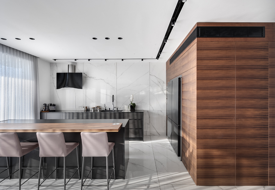 הרצפה חופתה באריחי ענק של גרניט פורצלן דמוי שיש לבן, עם גידים אפורים. האריחים הללו מפארים גם את רצפת המטבח ואת הקיר. במטבח ארונות גבוהים שמחפים קיר שלם, אשר מחופים בעץ אגוז אלגנטי, לצדם ארונות נמוכים עם משטח עבודה רחב ידיים ואי מרווח ומעוצב כך שחלקו מחופה במשטח גרניט פורצלן ותחתיו ארונות לאחסון, וחלקו האחר משמש כשולחן חשוף, עם רגלי עץ, מחופה בגרניט שחור. סביב האי כיסאות בר ורודים שמעניקים רכות ומזמינים לשבת במקום המרכזי בבית.