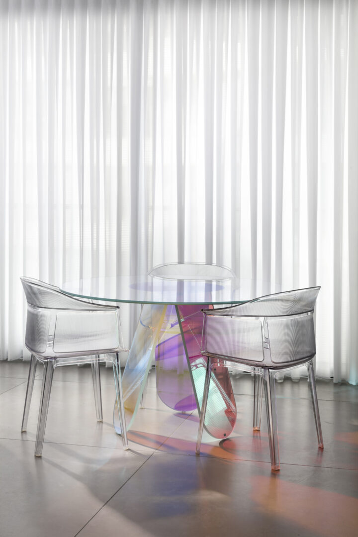 פינת האוכל ממוקמת בין המטבח לסלון. הרעיון היה לתכנן פינה עדינה ואוורירית וכך נולדה פינת האוכל השקופה. פינה מיוחדת ועוצמתית בשל העבודה שהיא סוג של הולוגרמה, כך שמכל כיוון שמתבוננים בה קרני השמש שפוגעות בה משנות את צבעה – פעם סגול, כתום, שקוף וכו. מאחר ופינת האוכל מיוחדת, הוחלט שלא למקם מעליה גוף תאורה עוצמתי, נהפוכו – מעליה ממוקמת תאורת צילינדר קטנה עם אור ששובר את הזכוכית ומשחק עם הצבעים.