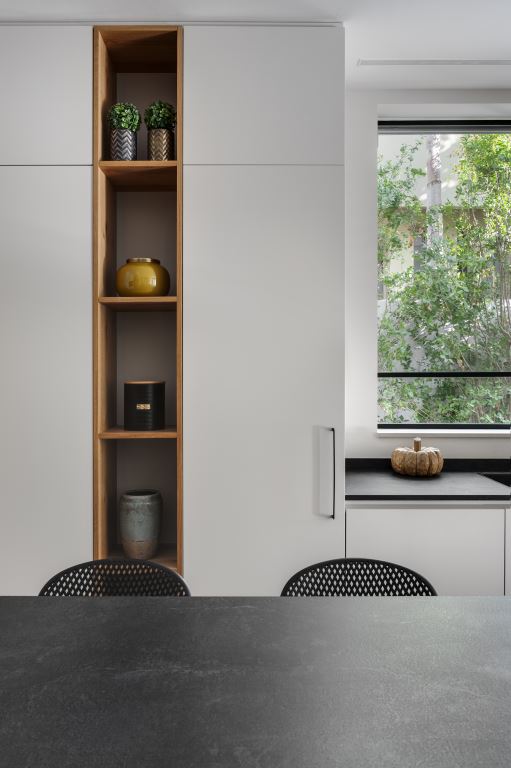 חלל המטבח היה קטן יחסית, עם מזווה כמו של פעם, בחלל מסדרון צר. רוט מספרת כי החליטו לבטל אותו וליצור מטבח מודרני בשני קווים, פתוח בחלל הציבורי, תוך שמירה על ניקיון עיצובי דרך הטמעה אינטגרלית של המקרר, לדוגמה, ויצירת אי נוח המתאים לבישול ולישיבה סביבו, שגם בו מוטמעים היטב אביזרי החשמל. אחת הטקטיקות הייתה להיעזר במשטח שיש שחור, שבו הוטמעו כיריים חשמליים. דבר שמטשטש את קיומם הוויזואלי ושומר על פרקטיות. "יצרנו המון שטחי אחסון שמסתירים את הבלגן. מוצרי חשמל לא קופצים לעיניים. ובעצם יצרנו חלל חווייתי שמבסס את מעמדו של המטבח כאיזור הכי משפחתי בבית", מסבירה רוט. "נגמר הסיפור שבו המטבח סגור ומוסתר בחלל משלו. היום הכל קורה במטבח, ואין צורך לשים את מי שמבשל בעונש. כך המבשל יכול לדבר עם הסועדים, להיות חלק מהשיח כשמארחים. המטבח הופך לזירת אירוח, ממש כמו בתוכנית בישול". רוט מציינת שהמטבח הפך לדומיננטי ולמרכזי, דבר שמתבטא באופן עיצובו, בבחירת החומרים והגוונים שבו, וכן מהעובדה שהוא ציר מרכזי גם פיזית, שאפשר לראות ממנו את הסלון, לצאת אל הגינה.