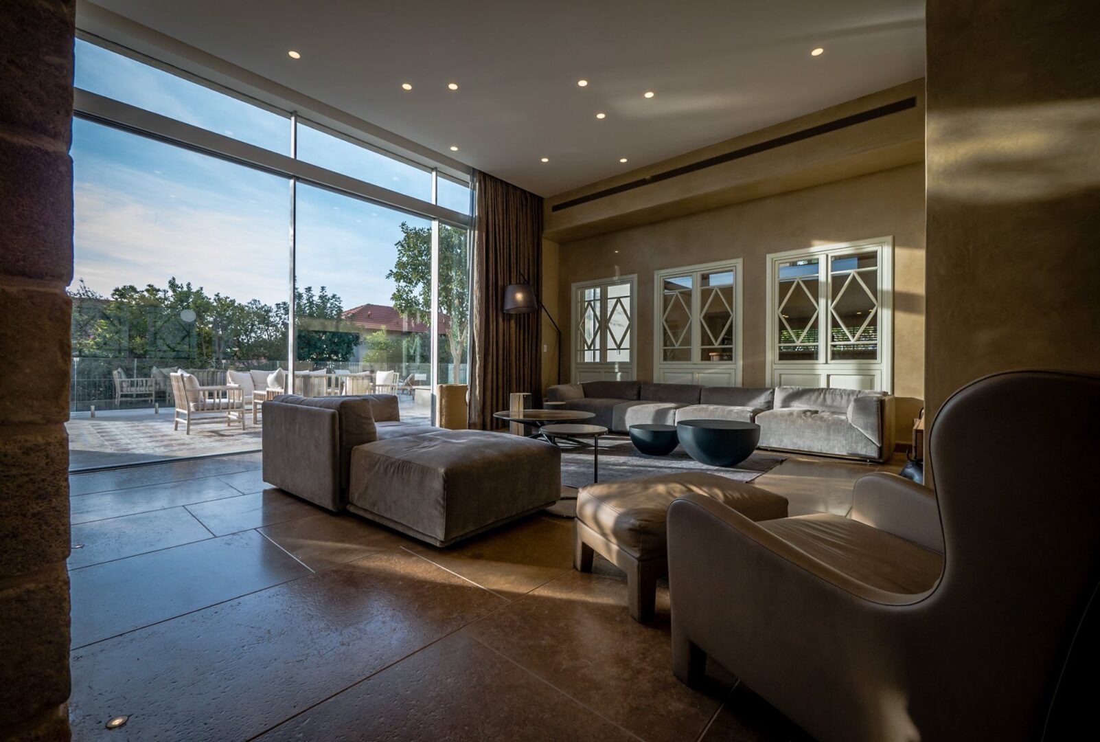 בסמוך ממוקם הסלון שקירותיו חופו טיח מרוקאי טדלק בגוון בהיר שמשתלב היטב עם מאפייני מבנה האבן. כמו בכל הבית גם עבור הסלון נבחרו פרטי הריהוט בקפידה, במטרה לאזן בין הנראות הכפרית לזו המודרנית, ואכן השימוש בצבעוניות שקטה ובבדים חלקים תרמו לכך. בתקרה שובצו מנורות שקועות קטנות ונסתרות שמייצרות לעת ערב תחושה של כוכבים.