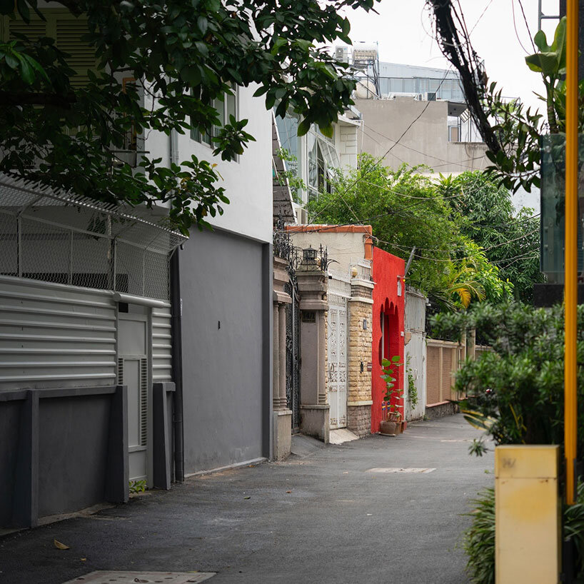 עבור סטודיו 72/8 Architects, השימוש בגימור אדום רווי הוא מרכזי בעיצוב. המשטח, המיושמים כטיח בטון צבעוני חשוף, מתייחסים לחומרים מסורתיים מדרום וייטנאמים כמו לכה ואריחי יין-יאנג, המפורשים מחדש באמצעות טכניקת בנייה עכשווית. הצבע יוצר נוכחות רחוב מיידית ומגדיר את האווירה המרחבית של הפנים.
