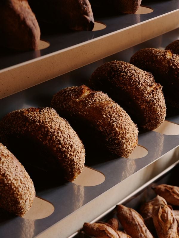 מדפי נירוסטה ליניאריים לאורך הקירות מציגים את הלחמים בסדר מוקפד המדבליט את צורתם האורגנית, בעוד חיפוי קירות מנייר וואשי בעבודת יד מוסיף רכות ואור מפוזר. גופי תאורה תואמים משלימים אווירה שקטה, כמעט מדיטטיבית, ומאזנים בין האלמנטים התעשייתיים לנוכחות חמה וטקטילית.