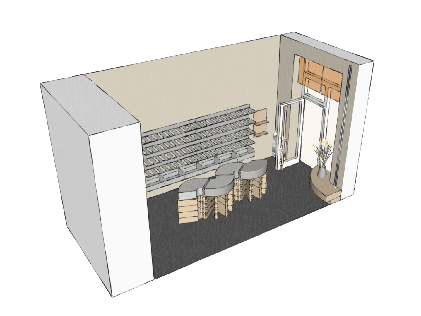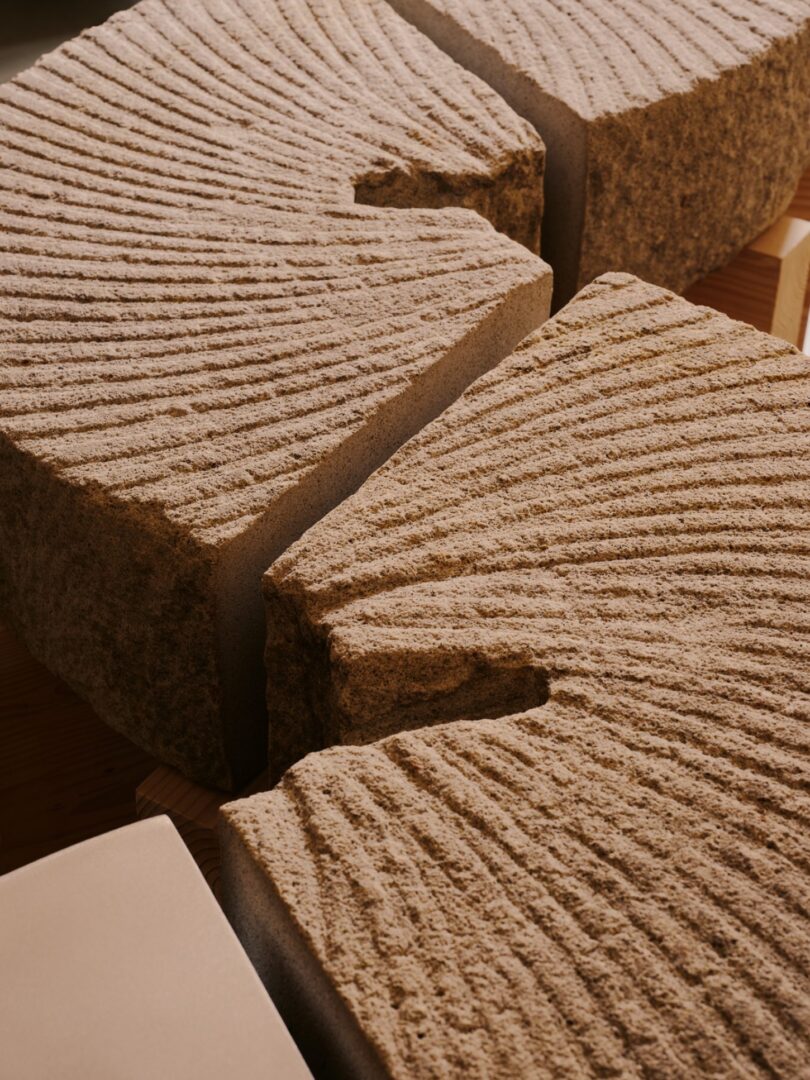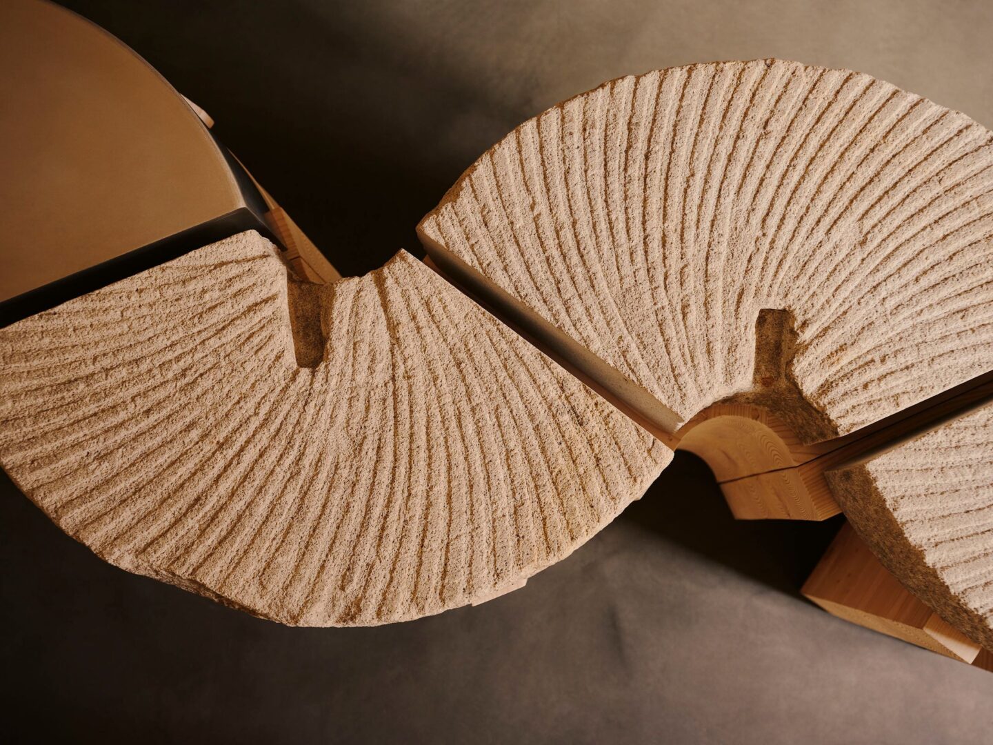 הסניף השלישי של המאפייה מעוצב כקומפוזיציה מדודה של אבן, עץ ופלדה. במרכזו ניצב דלפק פיסולי עשוי אבן רחיים ישנה, שנחתכה למקטעים מניפתיים ומסודרת בתנועה מתפתלת היוצרת תחושת זרימה בתוך מסה כבדה. המרקם המחוספס של האבן מודגש לצד המשכיות חלקה מנירוסטה, בעוד בסיסי עץ דאגלס מחזקים את תחושת הכנות החומרית.