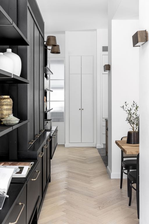 האי במטבח כולל משטח שיש דמוי חלודה, מתכתב נכון עם רצפת הבטון המוחלק. יתר חללי הבית בחיפוי פרקט שמספק חמימות נעימה. למטבח נבחרו 3 גופי תאורה תלויים דומיננטיים בצורת פעמונים עם גלזורה בסגנון וינטאז', שגם הם מוסיפים לאותה התכתבות שנעה בין הישן לחדש.
