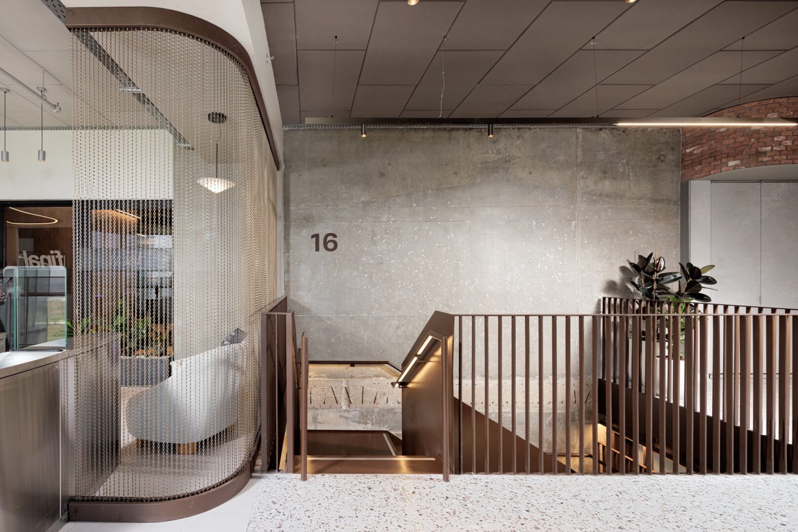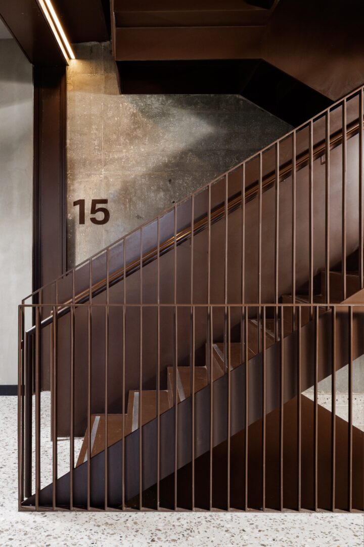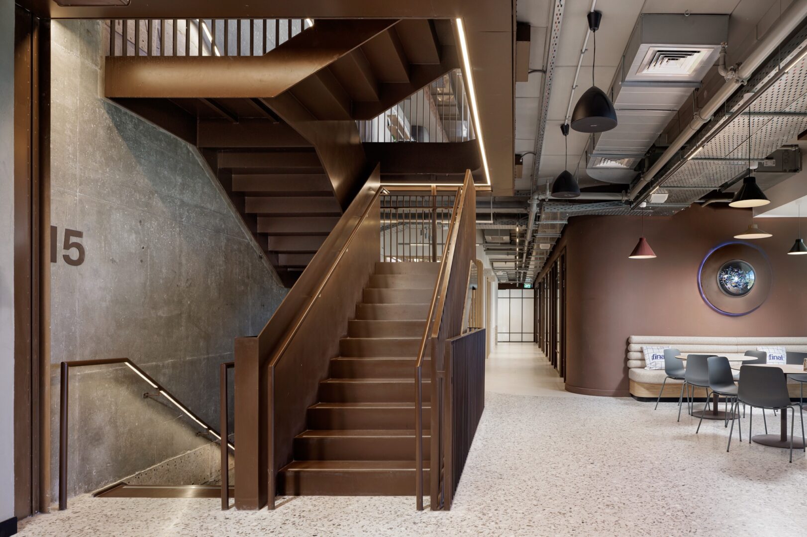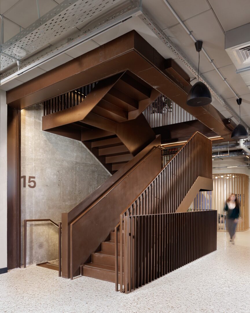 אלמנט מרכזי נוסף בפרויקט הוא גרם מדרגות מתכתי פיסולי המשלב תאורה, המחבר בין ארבע קומות המשרדים. המדרגות מתחילות בגינה יפנית רגועה במפלס התחתון, עוברות דרך מטבחונים בכל קומה, ומסתיימות בקפטריה המרכזית בקומה העליונה. פתרון זה יוצר רצף ויזואלי, משפר את הנגישות בין הקומות, ומעודד אינטראקציות ספונטניות בין העובדים, תוך חיזוק תחושת הקהילה בארגון.