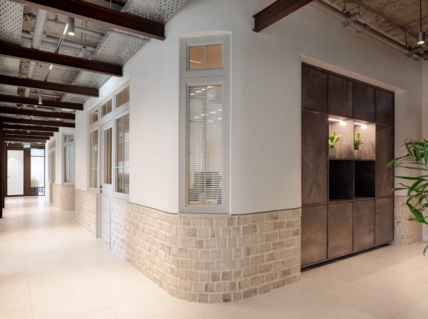 השילוב בין גימורים גולמיים לבין חמימות של עץ טבעי ורצפות פרקט יוצר איזון בין שקיפות מודרנית לבין תחושת ביתיות, ומדגיש את החיבור בין עולמות ישן וחדש.