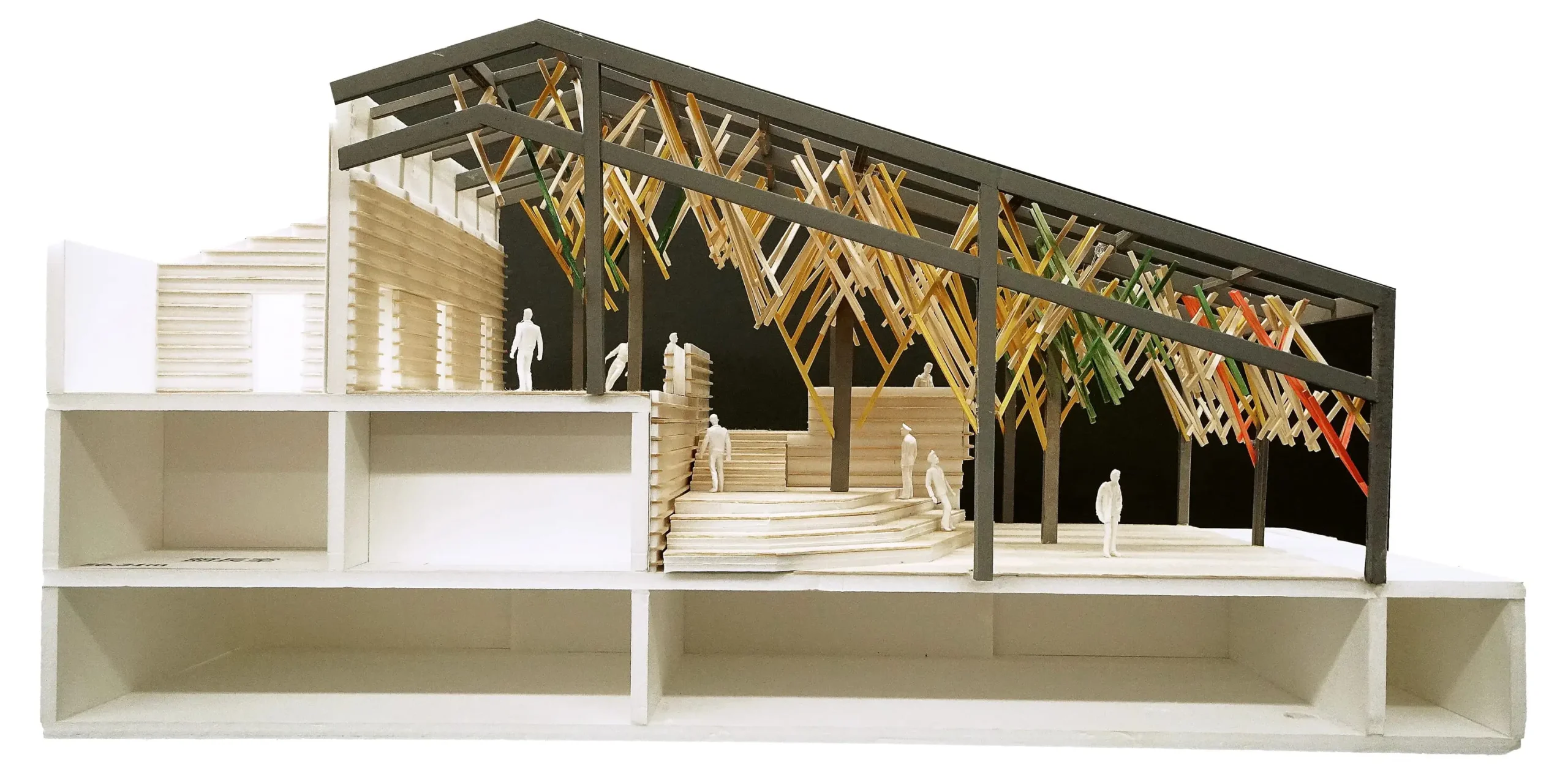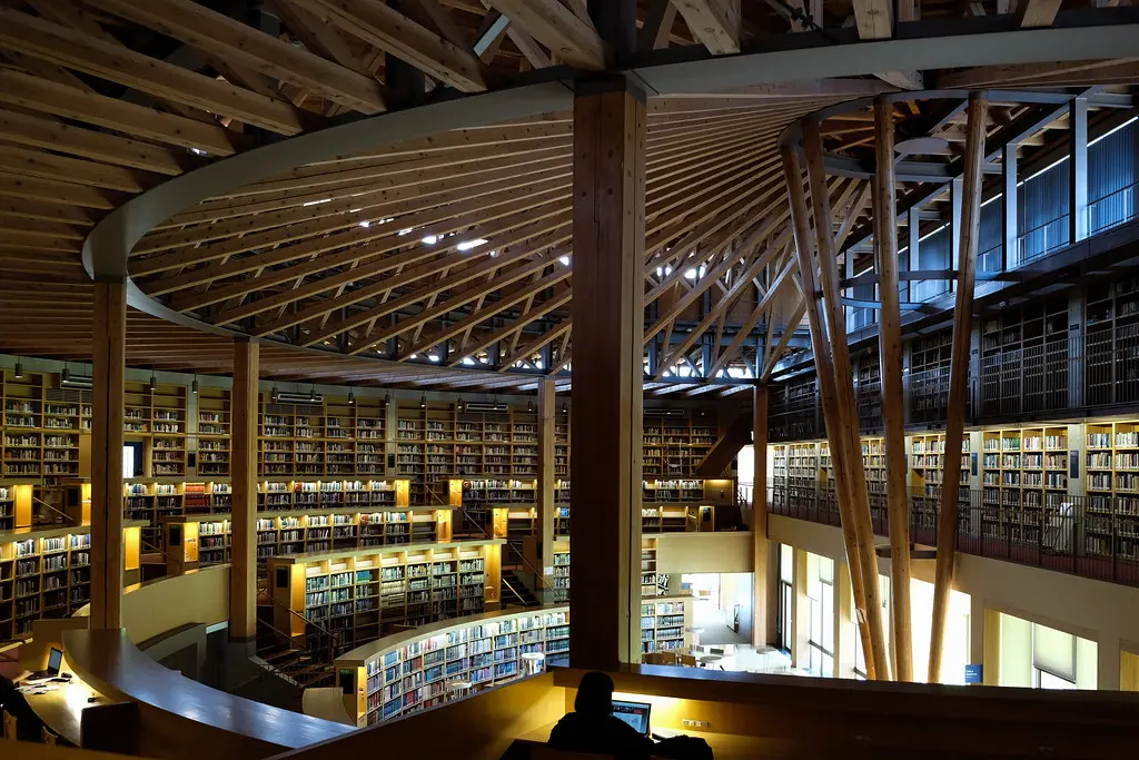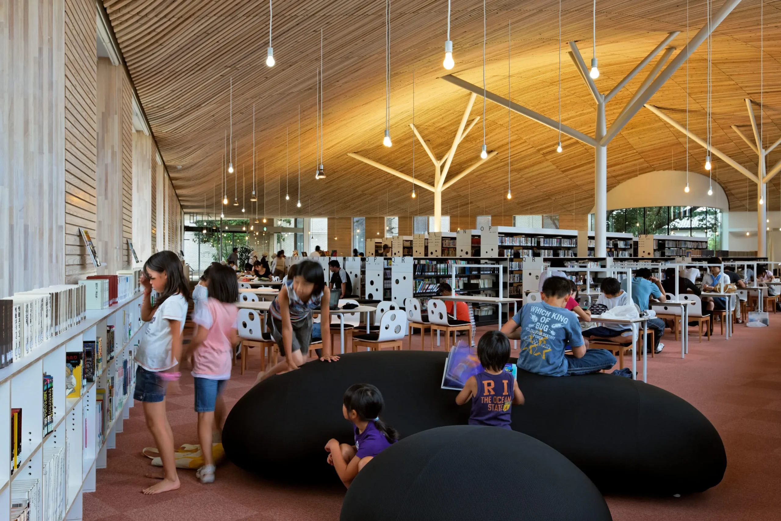 כדי לבנות את רשת הסבכות של הספרייה – המזכירה צמרות עצים – השתמשה קומה בעץ סוגי, שהוא יליד האזור. המבקרים יכולים ליהנות מהמרקם והריח של העץ כאן, תוך התפעלות מהעיצוב המורכב של התקרה. הספרייה כוללת גם מתקני טיפוס על בולדרים ובית קפה.