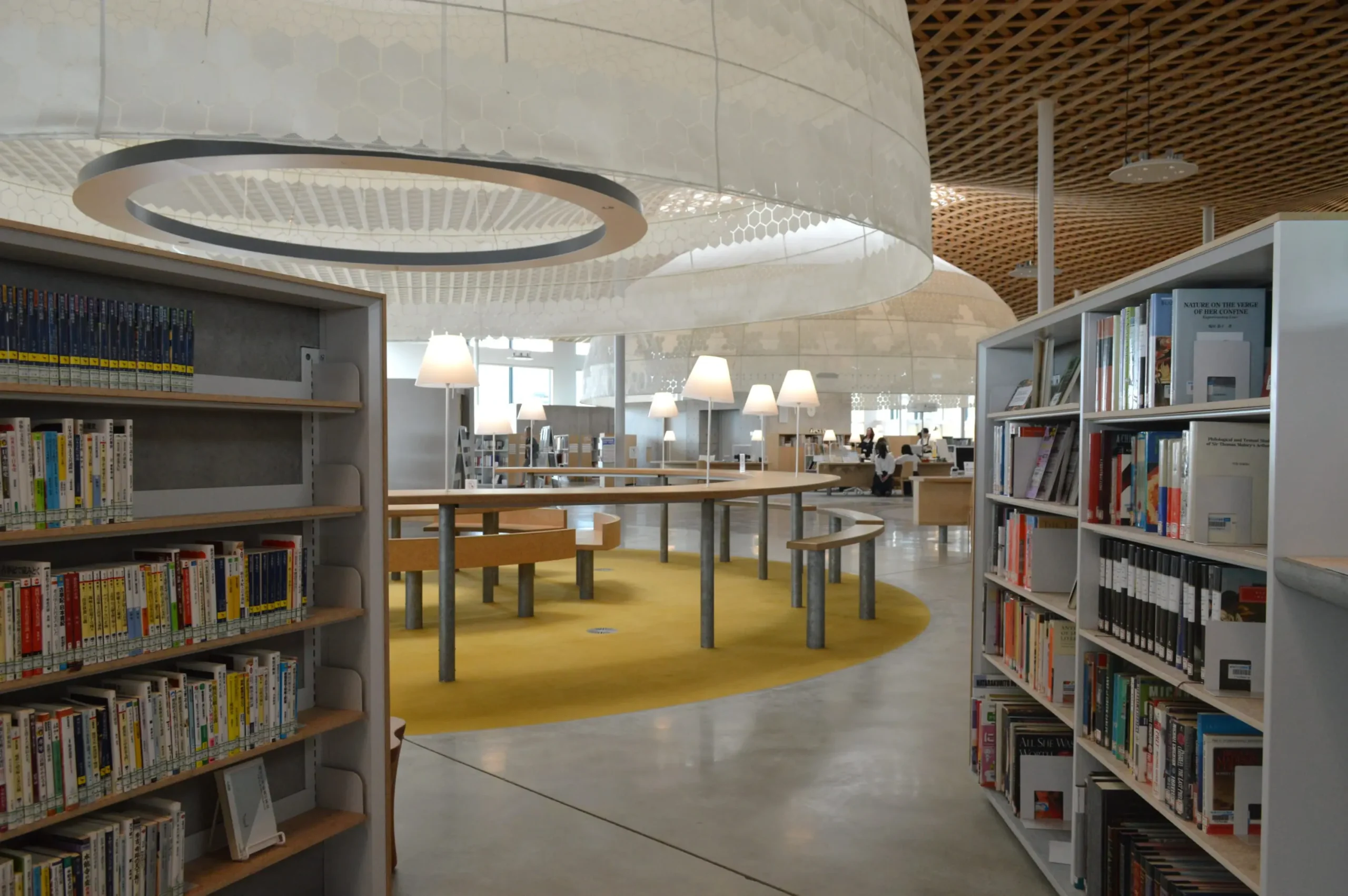 בקרו בספרייה בקומה השנייה בתערוכה "יער מטריות" מדהים, הכולל 11 חצאי כדורים גדולים עשויים בד ארוג תלת-צירי, לכל אחד דוגמה משלו, התלויים מתקרת הספרייה הגלית, ומטילים זוהר רך על החלל. עיצוב הספרייה הוא בו זמנית עתידני אך אורגני, מינימליסטי אך גם גחמני, מה שהופך אותה למקום שחובה לבקר בו. למתקן יש אפילו גופן משלו בשם Minna no Mori, המשמש בכל רחבי הבניין, ליפנית, אנגלית וספרות.