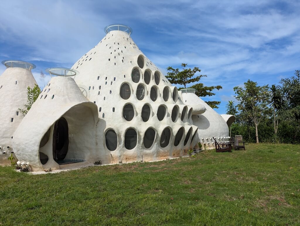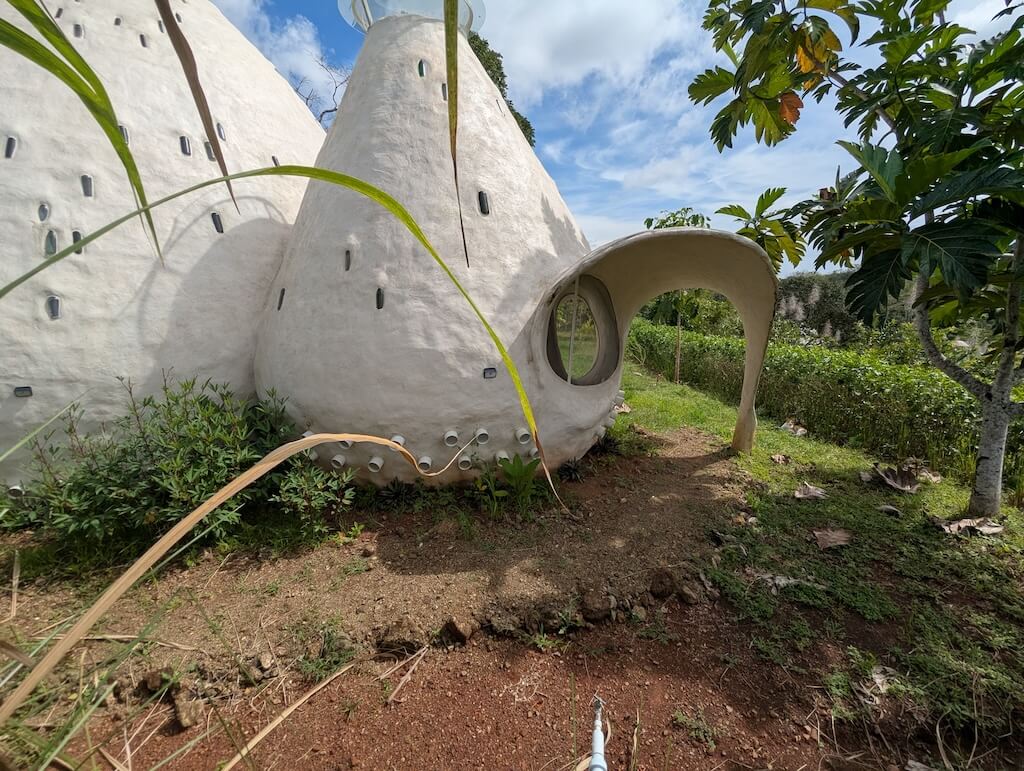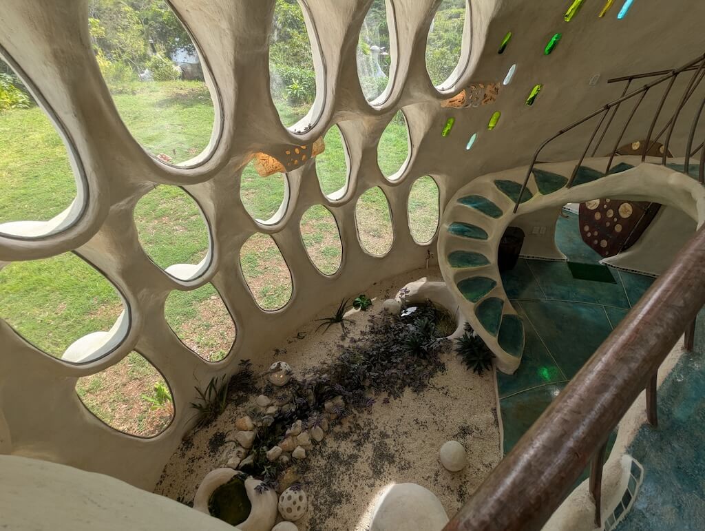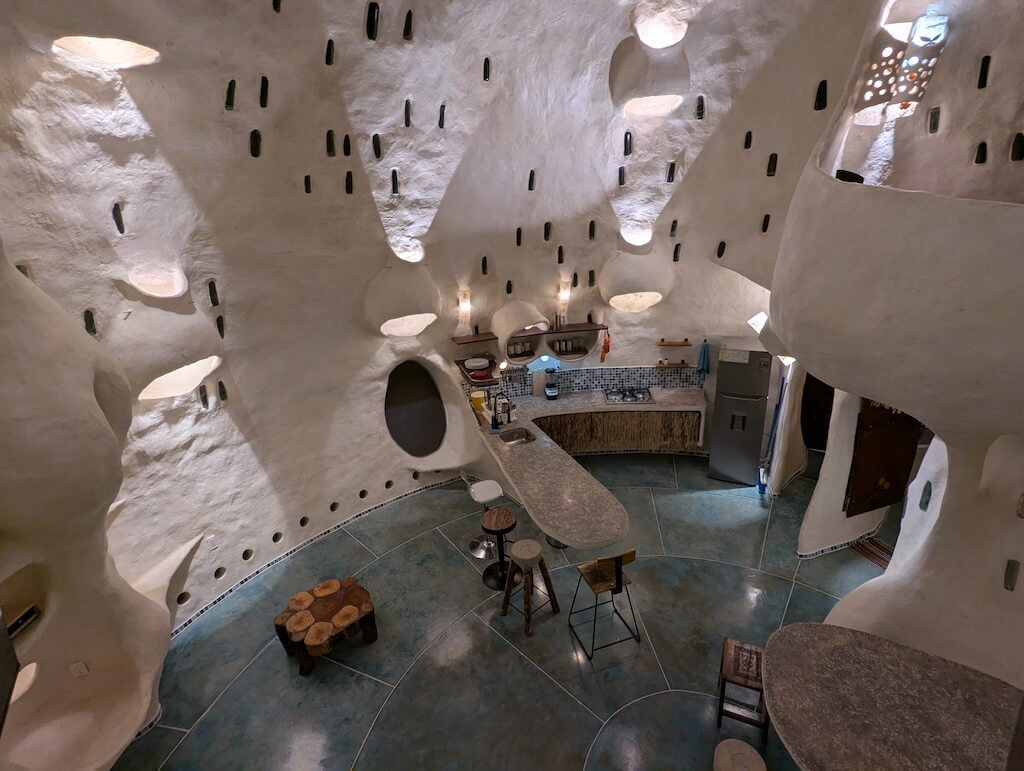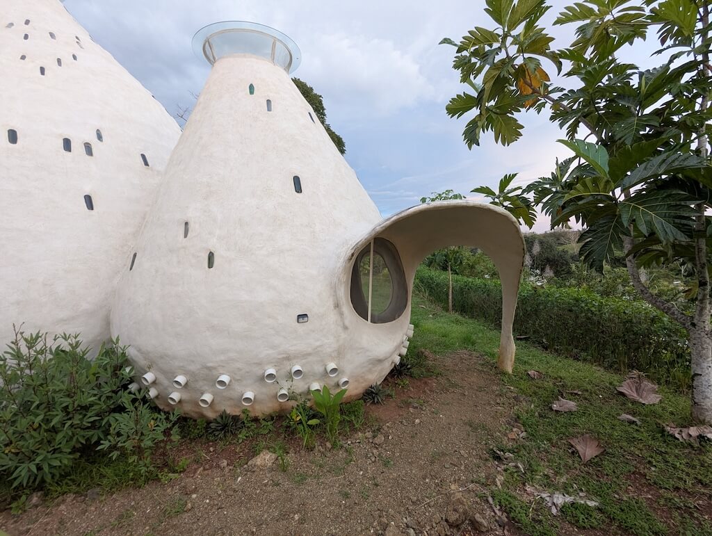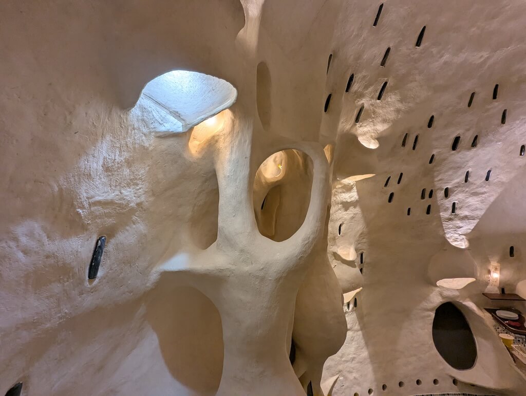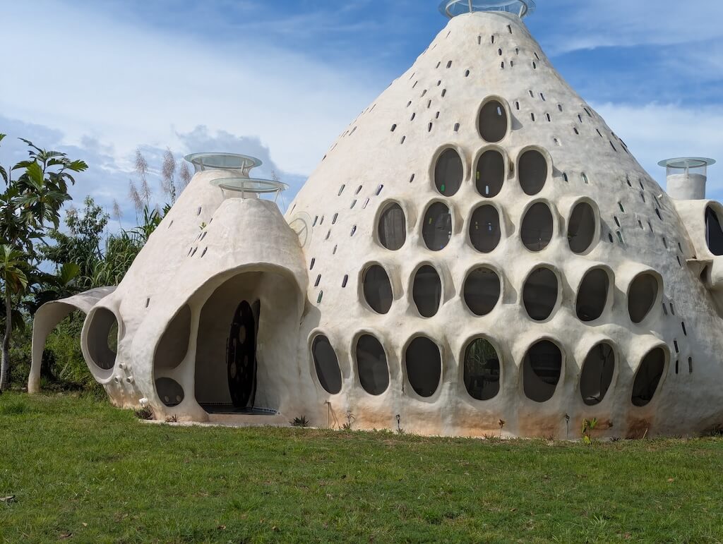הפרויקט האחרון שלו, בית מגורים אורגני המצולם בגלריה, מדגים תפיסה זו הלכה למעשה. המבנה מדמה אשכול טבעי דמוי בצל: כיפה מרכזית הצומחת כלפי מעלה, מוקפת “ניצנים” קטנים יותר – כיפות משניות המתחרות על אור, אוויר ומרחב, בדומה לאופן שבו מבנים טבעיים מתפתחים. עם התקדמות ה”צמיחה”, האלמנטים התומכים מתפוגגים ויוצרים פתחים עגולים, חללים בועתיים ומעברים זורמים בין פנים לחוץ.
