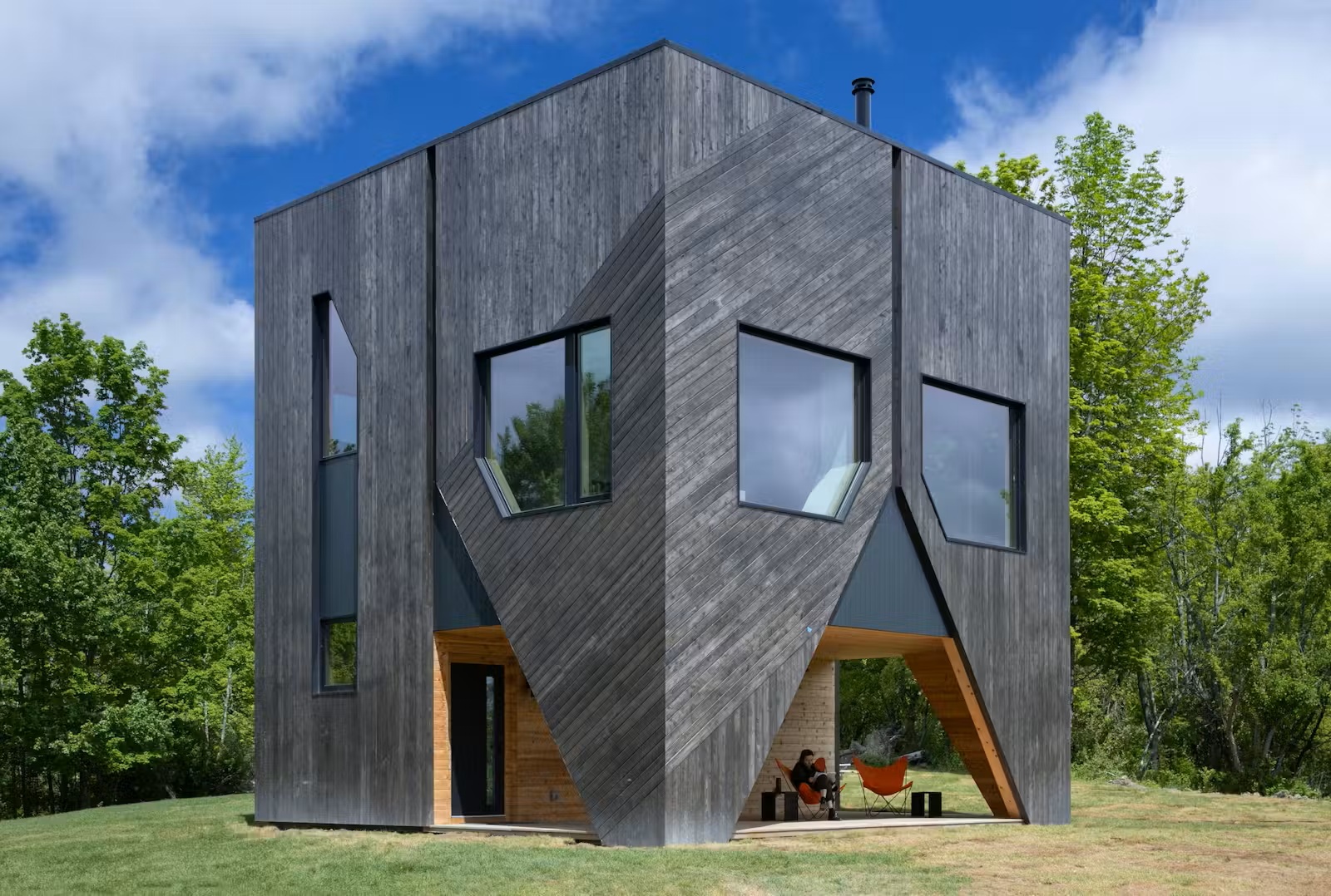בבית שתכננו האדריכלים Miroslava Brooks ו-Daniel Markiewicz, נוצרה מרפסת קרקעית יוצאת דופן: חלל מקורה אך פתוח, עם פתחים גיאומטריים שממסגרים את הנוף. התוצאה היא אזור ביניים שמטשטש לחלוטין את הגבול בין פנים לחוץ — וגם מרים את חללי המגורים לקבלת מבט רחב יותר.