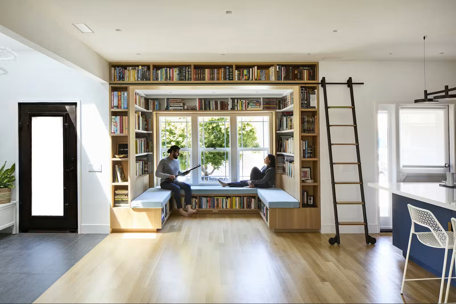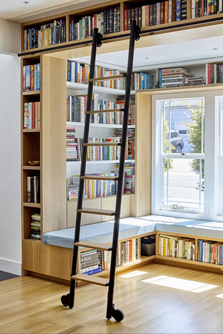 המעצבת Anne Poon הפכה פינת חלון קטנה לספרייה מיניאטורית מרשימה. באמצעות מערכת מודולרית מדויקת וסולם מותאם אישית, נוצר חלל שמרגיש כמו חדר בפני עצמו — בתוך אזור פתוח.