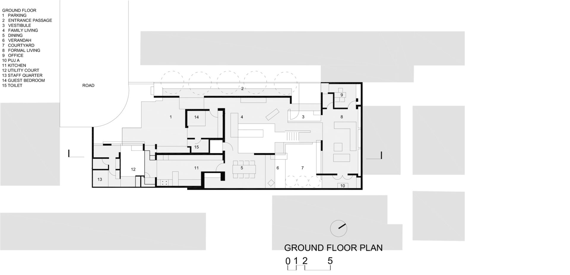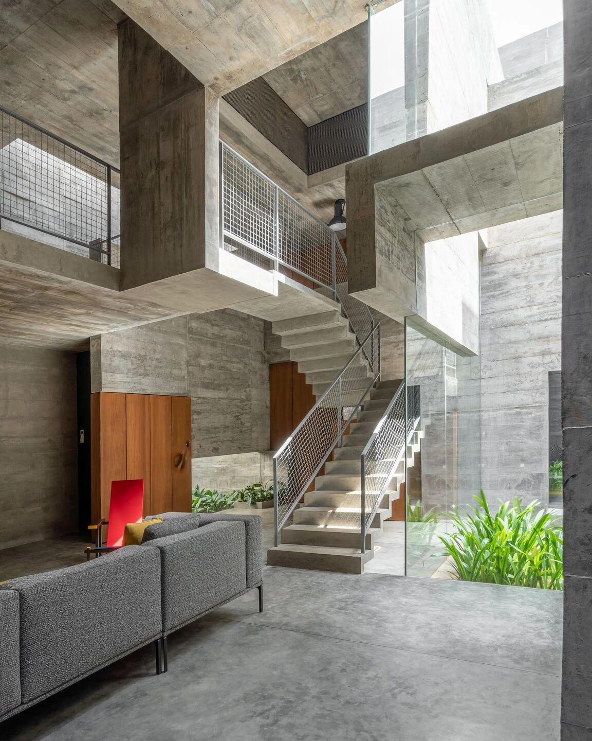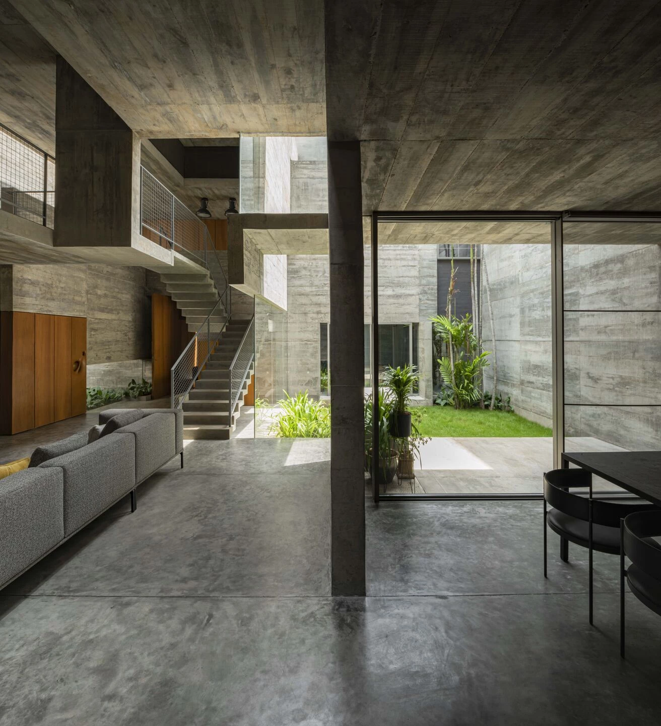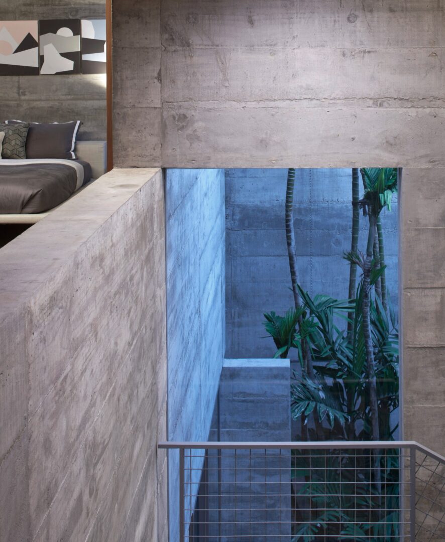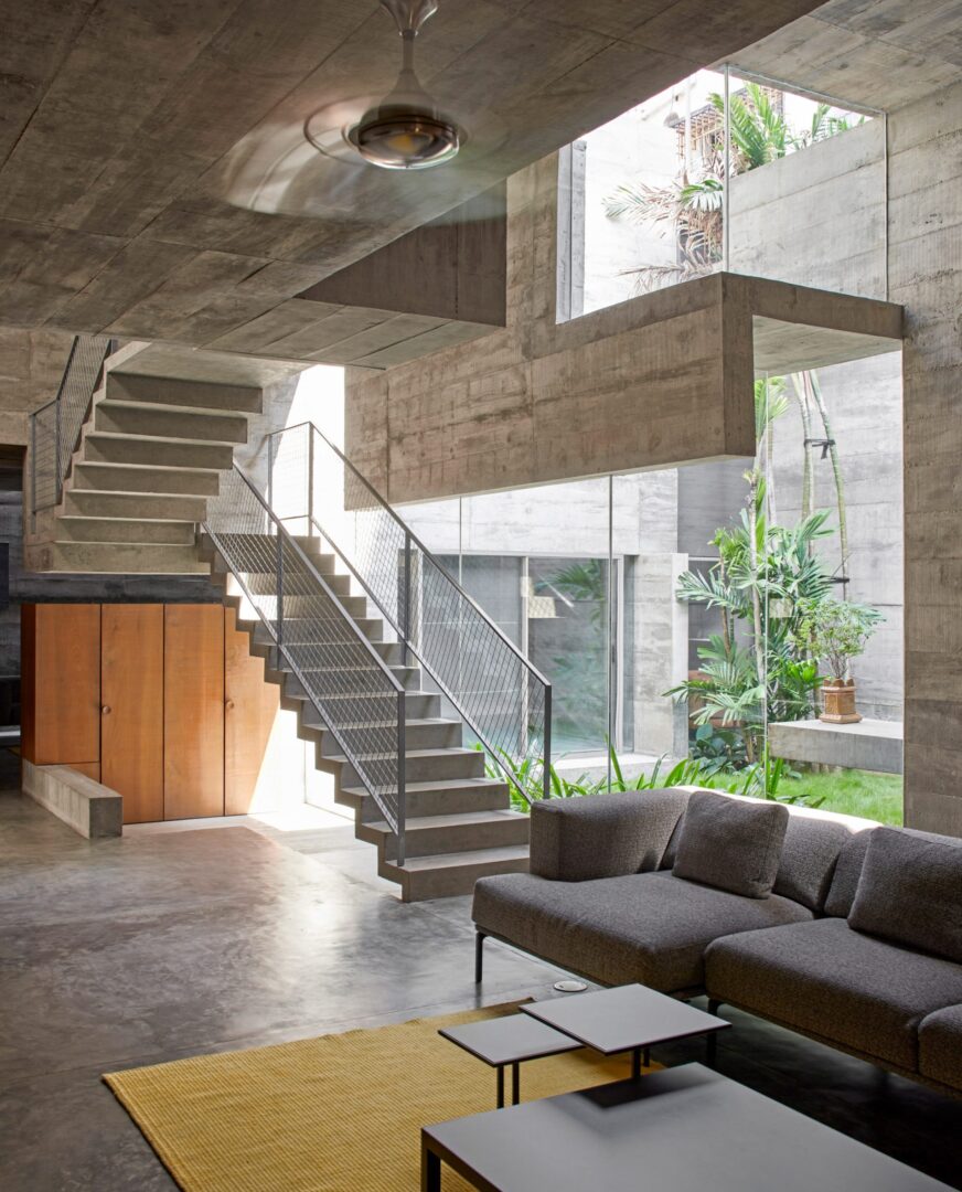 תוך ניצול תקנון רשויות הפיתוח המאפשר בנייה מקיר לקיר, הבית משתרע עד קצוות האתר משלושה צדדים – כדי למקסם את שטחי הרצפה הניתנים לשימוש, ולנצל חללים שוליים מתים אחרת. מישור בטון עוטף את ההיקף, ויוצר קליפה מונוליטית המגנה על תכולתה מהעולם שבחוץ. רק עם הכניסה, המישור נפרש וחושף את מרכזו החלול. בהתבסס על רעיון החצר ההודית המסורתית, חללים גדולים נחצבים מבפנים – ומכניסים שפע של אור, אוויר וירוק. החצר הגדולה ביותר ממוקמת בלב הבית ומתמשכת בצורה חלקה פנימה בקומת הקרקע – משטח רצפה פתוח וגמיש של אזורי המגורים של הבית. הוא גם מפריד וגם מחבר את אזורי המגורים הפורמליים מהפרטיים המקיפים אותו – כדי ליצור את מרכז חיי המשפחה, שם פעילויות יכולות להתכנס.