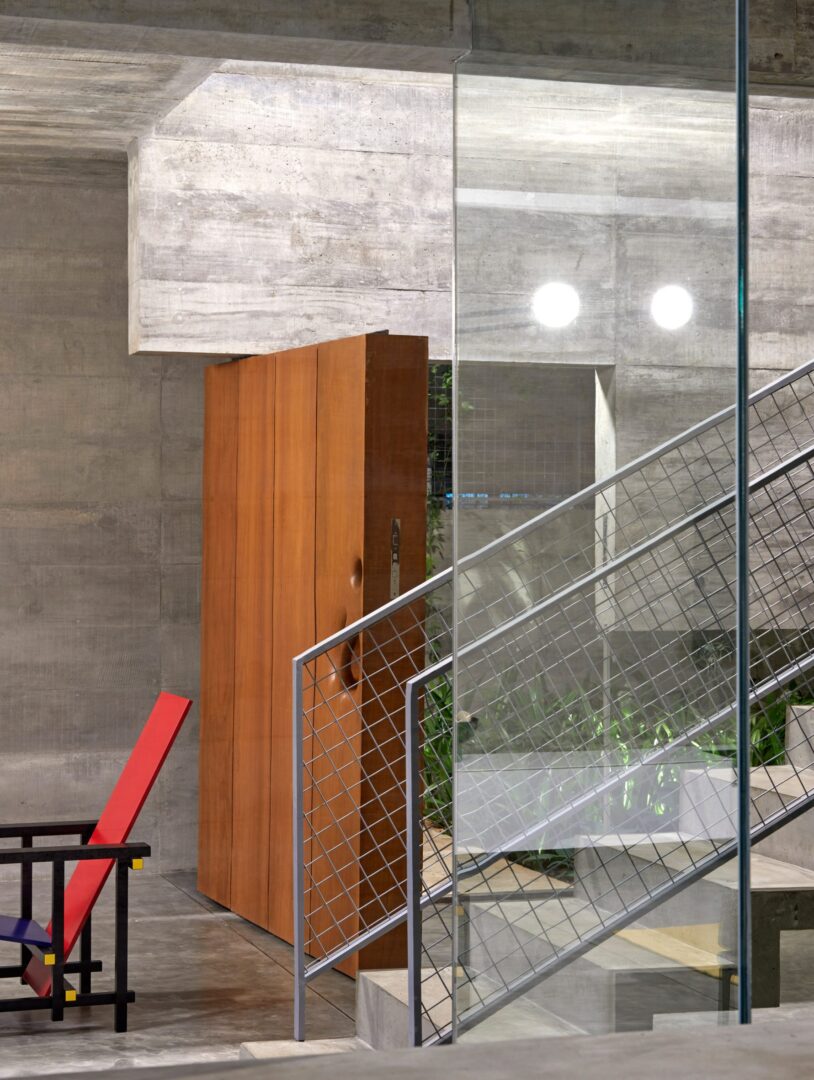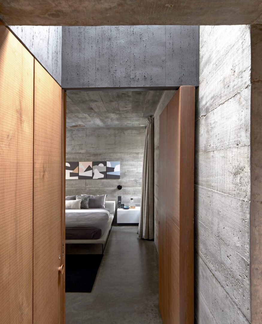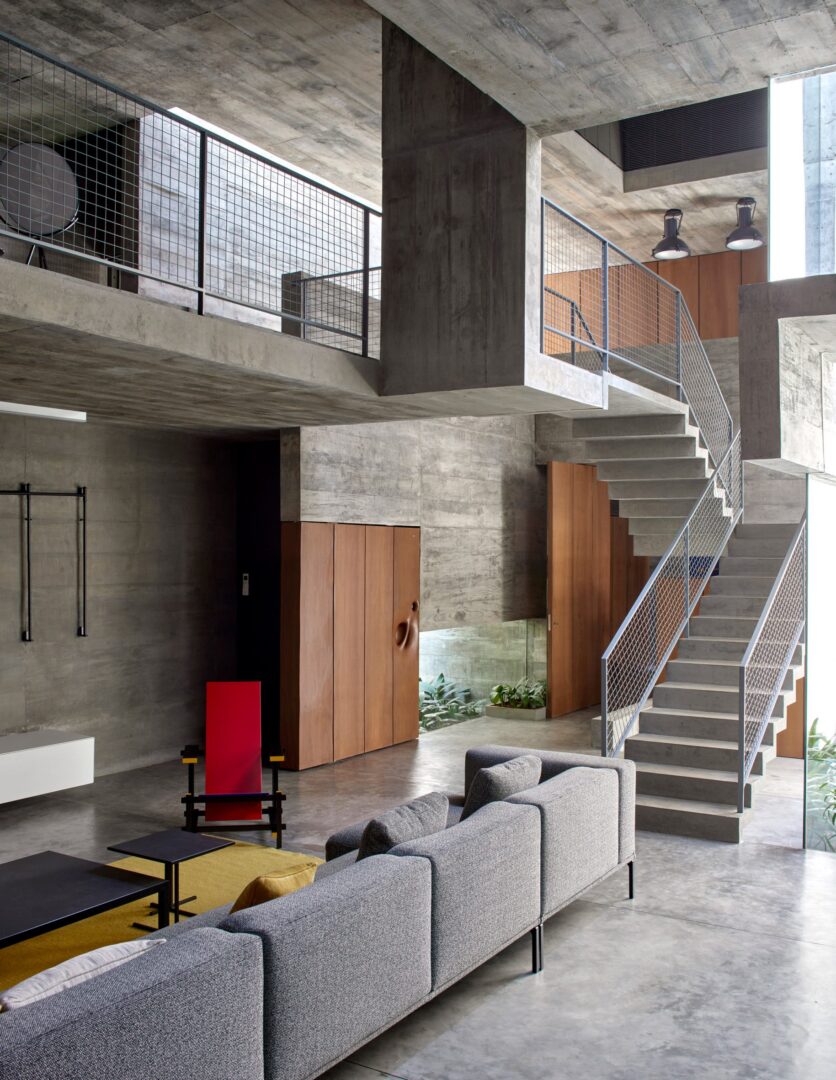 המדרגות, הקירות והלוחות נשקפים בצורה שונה מהפתרונות המבניים הבסיסיים שלהם. במקום להישאר חלקים פונקציונליים רגועים, הם מטופלים כמישור בטון רציף בתלת מימד המקיף חללים ומחבר את הבית ברצף חלק של נפחים. הם חותכים, מתכופפים ומתקפלים כדי ליצור מושג מורגש של תנועה בתוך הבית – קומפוזיציה של מבנה קליל לכאורה, המוחזק באיזון ובמשחק עדינים ורעועים.