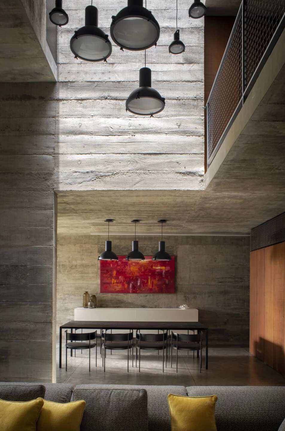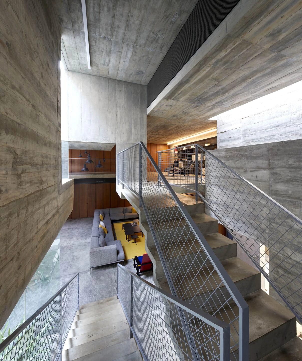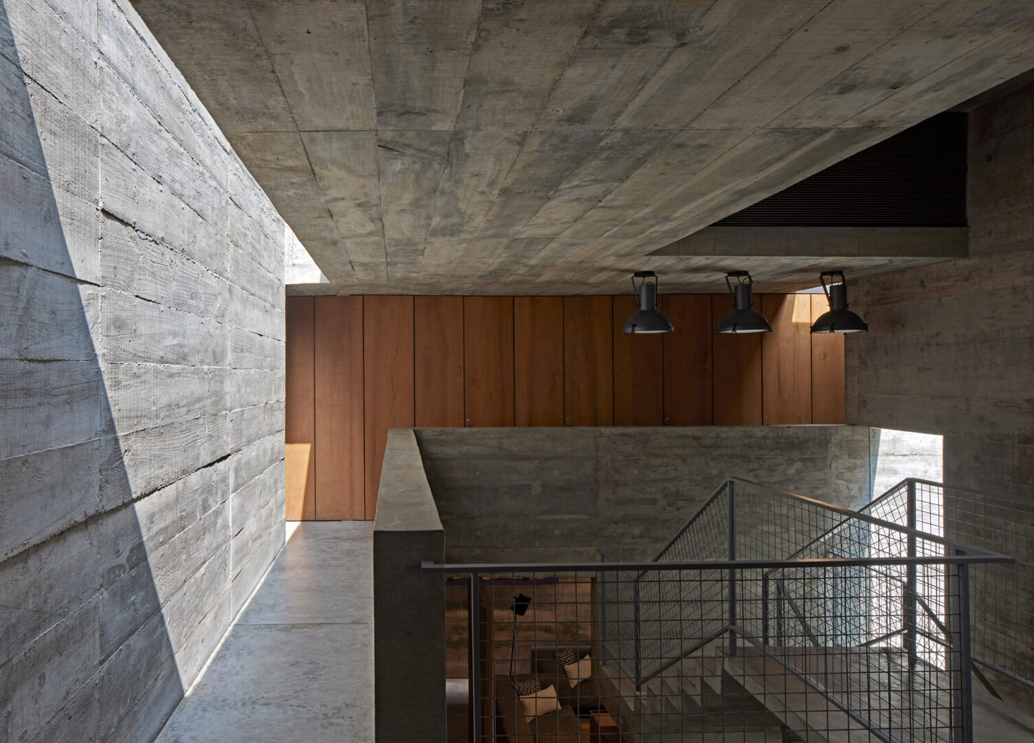המדרגות, הקירות והלוחות נשקפים בצורה שונה מהפתרונות המבניים הבסיסיים שלהם. במקום להישאר חלקים פונקציונליים רגועים, הם מטופלים כמישור בטון רציף בתלת מימד המקיף חללים ומחבר את הבית ברצף חלק של נפחים. הם חותכים, מתכופפים ומתקפלים כדי ליצור מושג מורגש של תנועה בתוך הבית – קומפוזיציה של מבנה קליל לכאורה, המוחזק באיזון ובמשחק עדינים ורעועים.