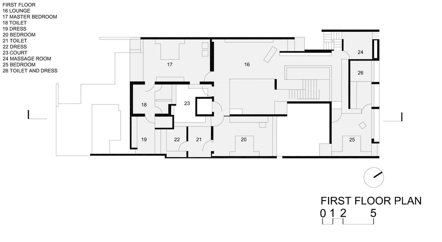 אזורים פרטיים מוגבהים לקומות העליונות של הבית ונפתחים לחצר משנית קטנה יותר. בניסיון לשבור את אורך הבית לחצר אינטימית יותר, רצפות הבלוקים שנוצרו משני צידי החצר נגישות מנחיתות המדרגות, ויוצרות מפלסים מפוצלים המשקיפים זה על זה.
