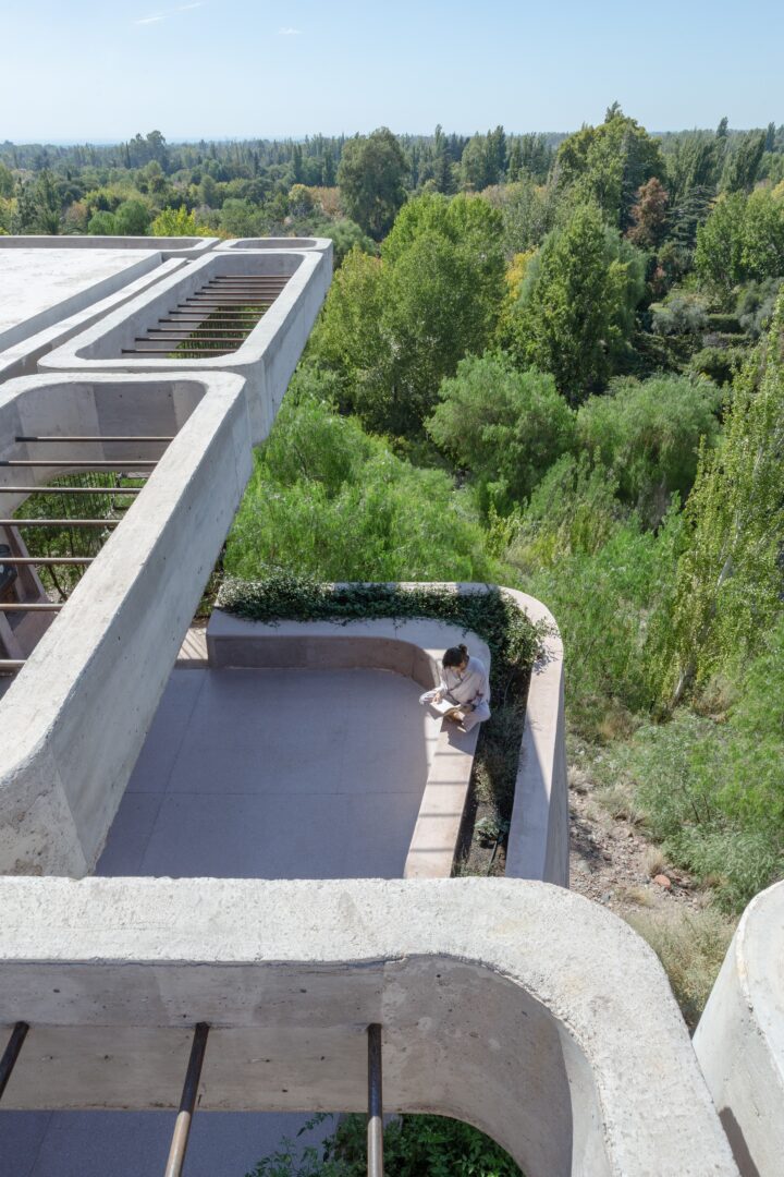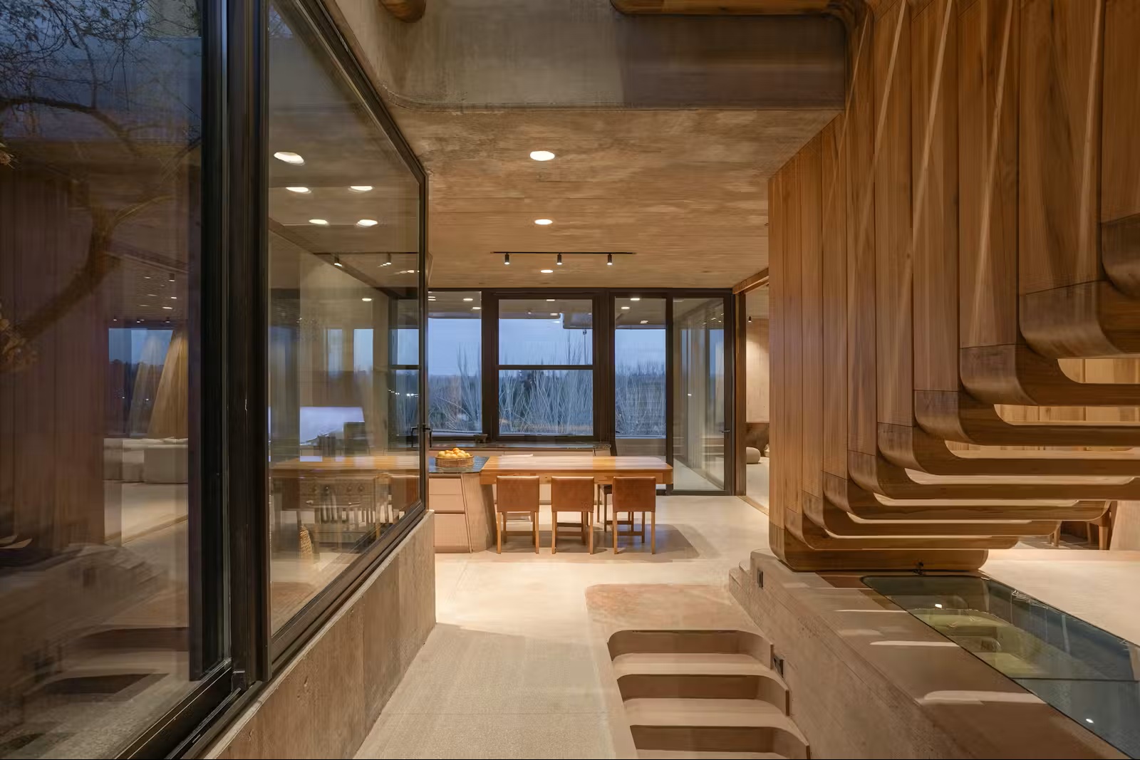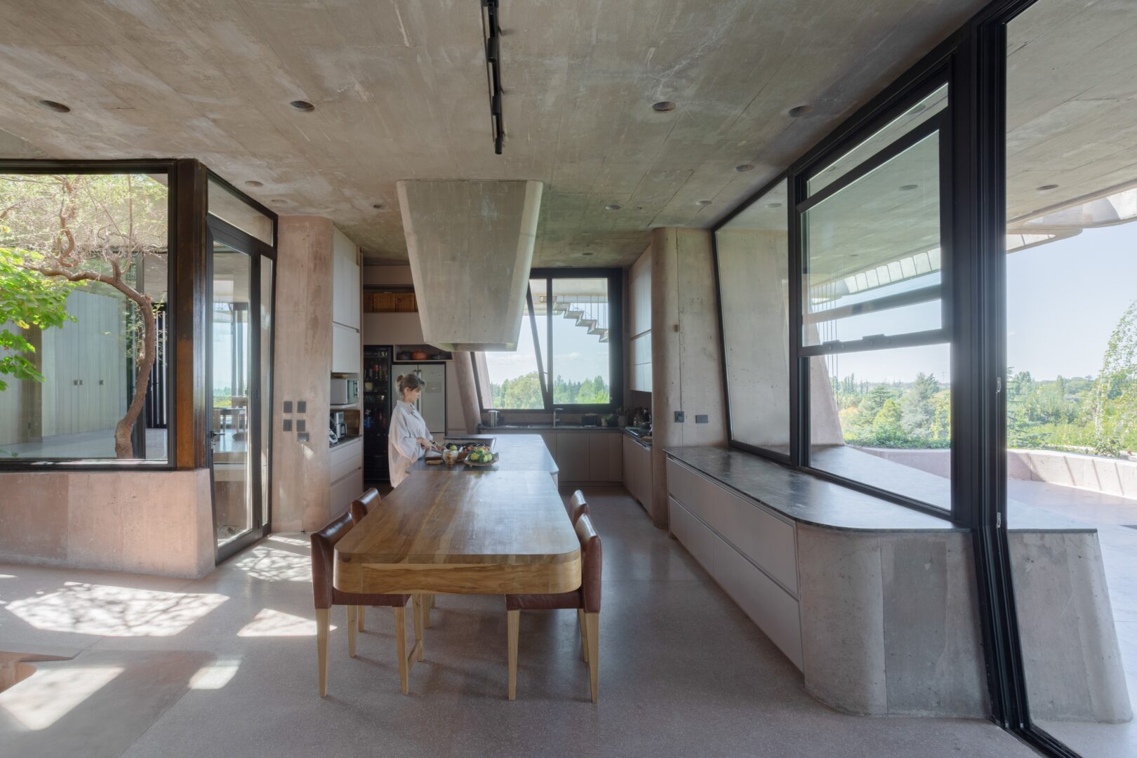 האתר, הממוקם בפדמונטה, מנדוסה, ארגנטינה, משתלב בצורה חלקה במדרון הקיים ובצמחייה המקומית – אף עץ לא נכרת במהלך הבנייה. מבחינה תכנותית, הבית נפרש בשלושה שלבים אנכיים של תפיסה: בתוך האדמה (מרתף), בין האדמה (קומת קרקע), ומחוץ לאדמה (קומה ראשונה). בלב הבית נמצא המטבח, עטוף בחללים משותפים ומחוברים על ידי שלושה גרמי מדרגות המציעים מסלולים חלופיים וחוויות מרחביות. ארבע טרסות מרחיבות את הבית החוצה. הטרסה הראשית ממשיכה את אזורי המגורים והאוכל אל הנוף. בסמוך, אזור הברביקיו תומך בהתכנסויות גדולות. טרסה שלישית, המחוברת לחדר המשחקים, מספקת מרחב עצמאי למחצה לילדים. מעל הכל, משטח הגג מציע אזורים ליוגה, אח, ג'קוזי וגנים, הממסגרים את הסביבה ומזמינים רגעים של שקט. בגובה הפונה לקניון, קירות בטון בגוון אדמה מגדירים את מסת הבית ומגנים עליו מפני חשיפה דרומית. המבנה נראה כאילו הוא עולה מהגבעה, אך טוען לזהות חדשה. בטון חשוף, שנבחר בשל תהודהו עם חומרים מקומיים.