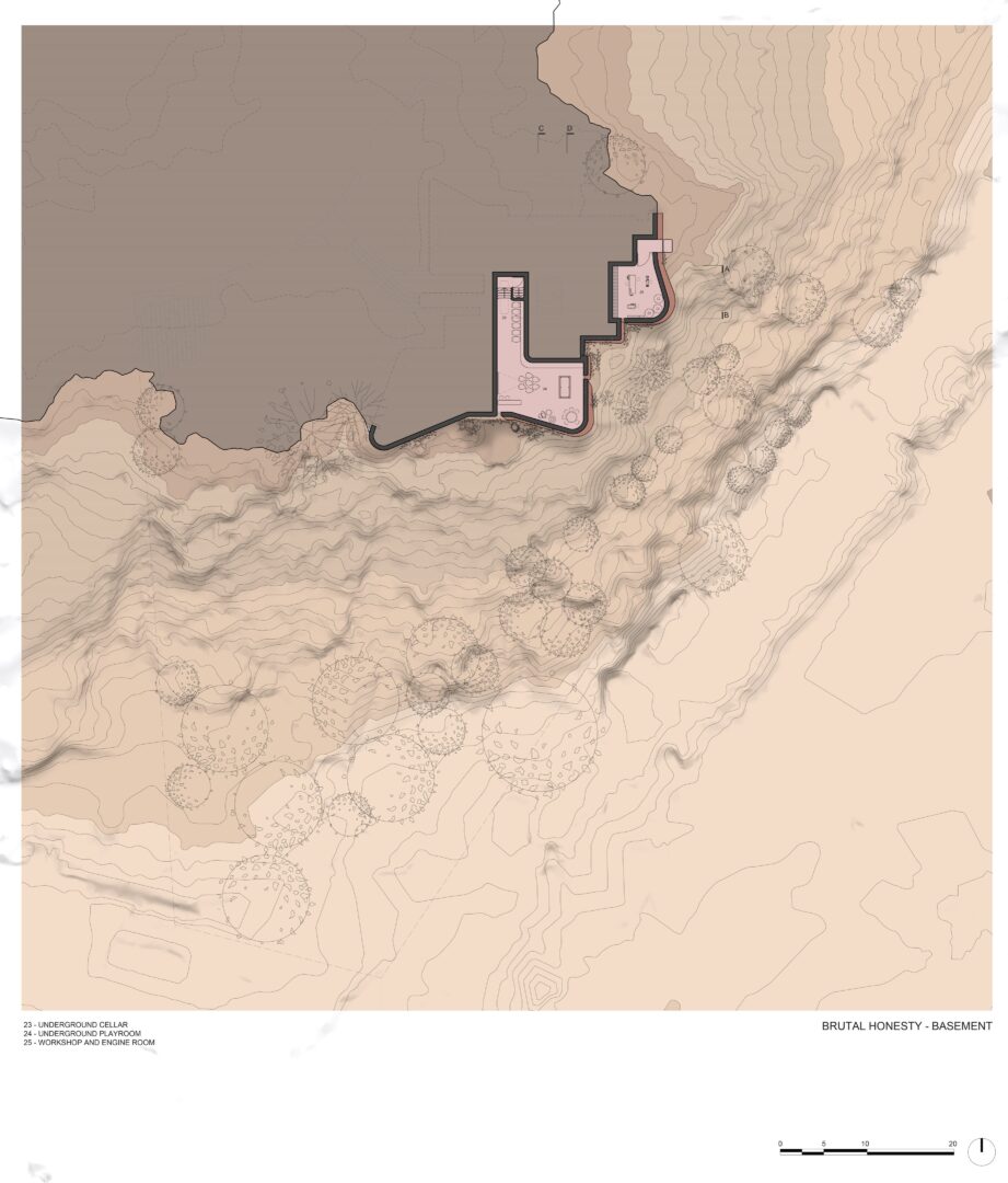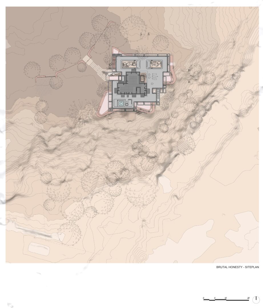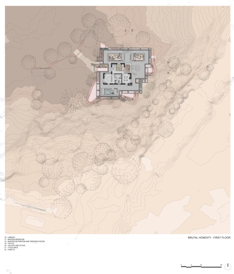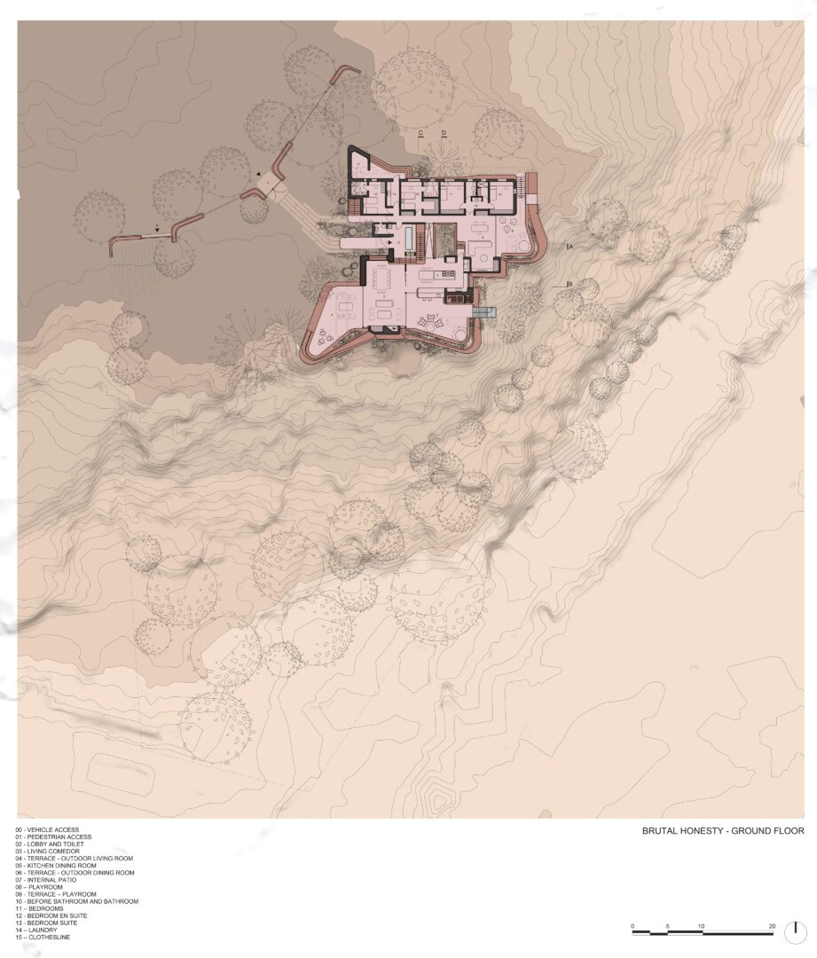 "Brutal Honesty הוא פרויקט המושרש בביטוי אדריכלי ישיר ואותנטיות גולמית. קירות תמך בצבעי אדמה מתנשאים מהשטח כמו תצורות סלע מופשטות, מגדירים שלוש טרסות ויוצרים מחיצות פנימיות המהדהדות את קווי המתאר של הקרקע. אלמנטים אלה מארגנים את החללים הפנימיים ומשקפים את אופן המגורים בבית, ומאמצים נרטיב שעוצב על ידי המשתמשים בו. המבנה, התומך במישור בטון ייחודי – רמה אפורה – נפתח לנופים של 360 מעלות של הרי מדבר האנדים והאואזיס שמתחת. הבית הופך להרחבה טקטונית של צלע הגבעה, ויוצר מערכת יחסים עמוקה וכנה עם סביבתו.