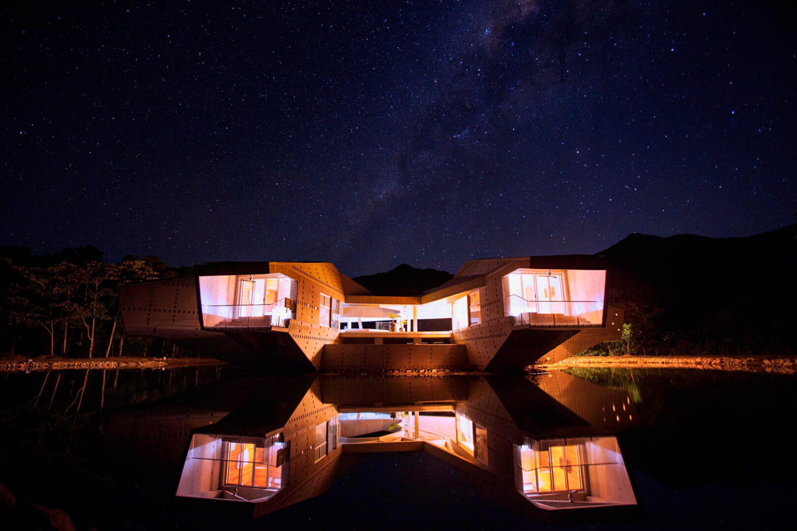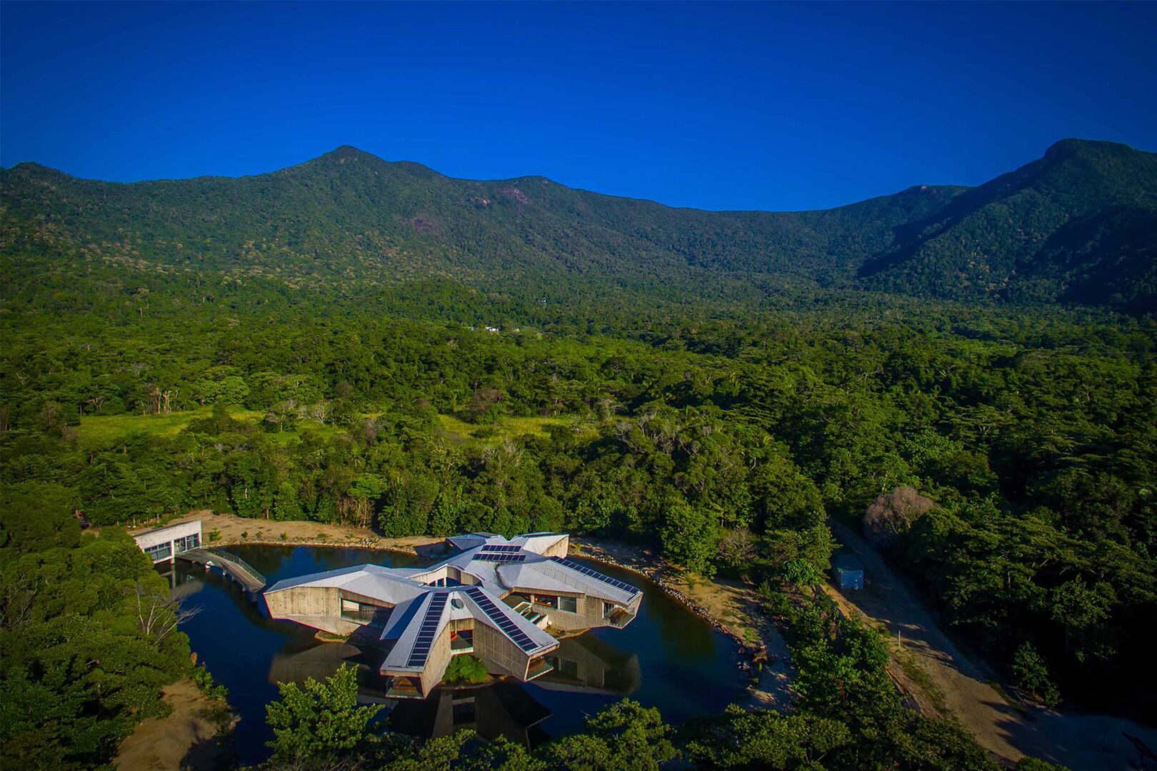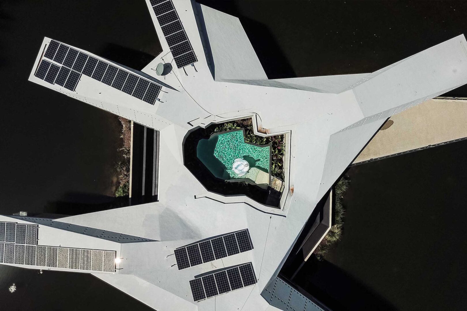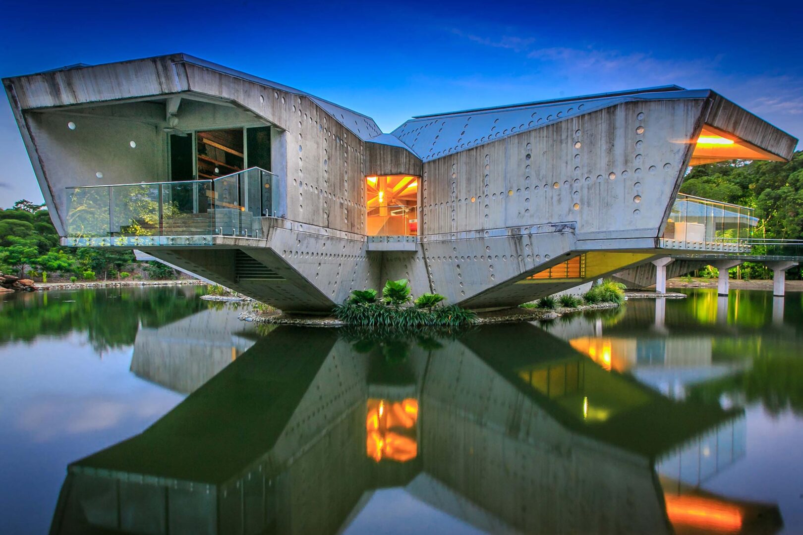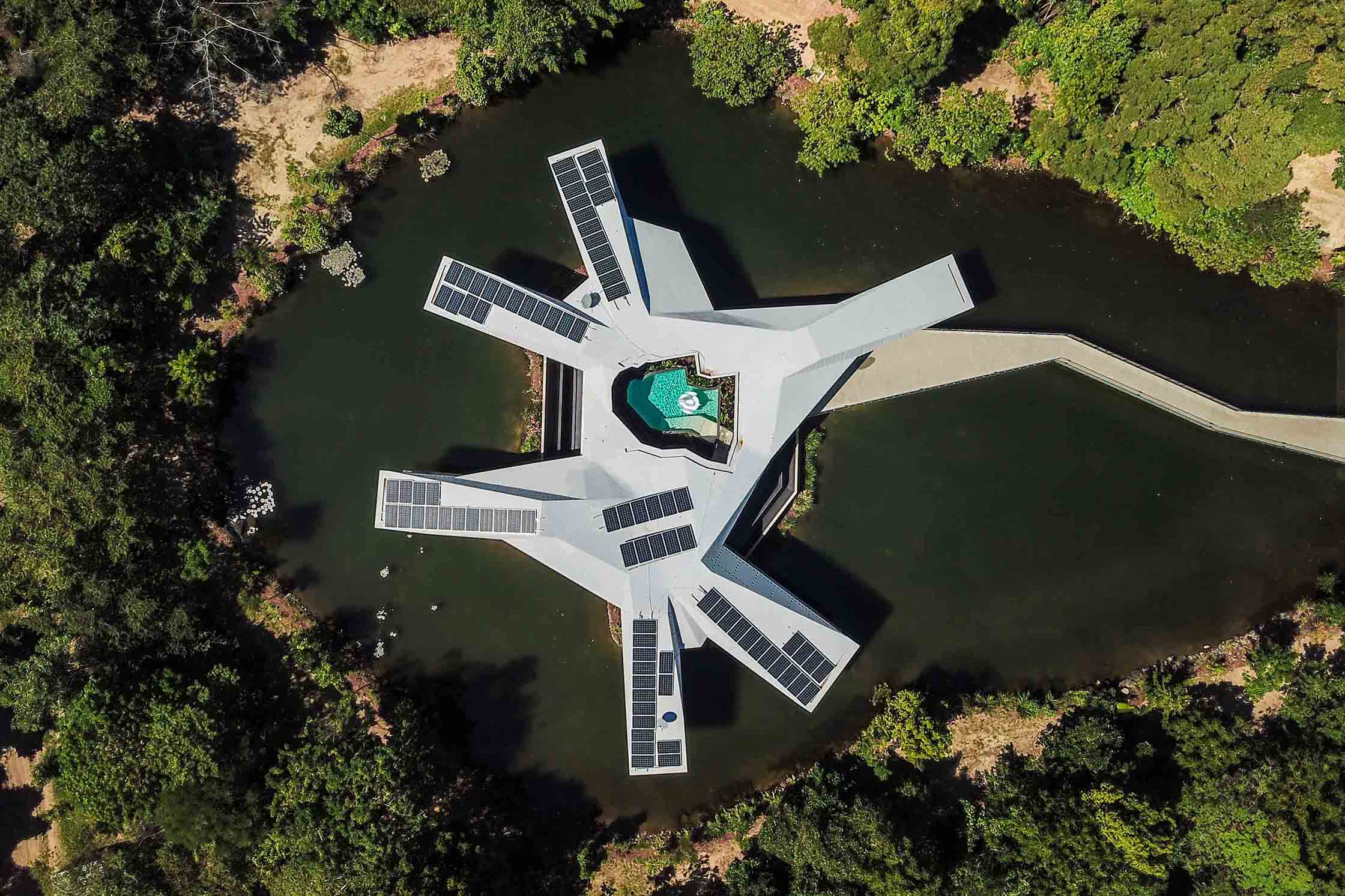 המבנה עצמו נראה כאילו נחת מהעתיד: שש “כנפיים” בטון ענקיות, מרחפות מעל אגם מלאכותי, מתפרשות כמו עלי לוטוס. מעבר למראה הדרמטי, העיצוב משרת גם פונקציונליות – הבית נבנה לעמוד בתנאי מזג אוויר קיצוניים, כולל ציקלונים בדרגה 5, ומשמש למעשה גם כמקלט בטוח.